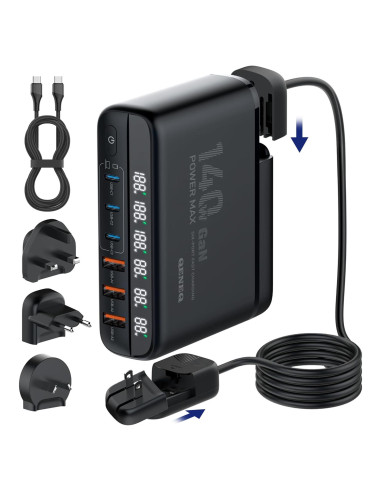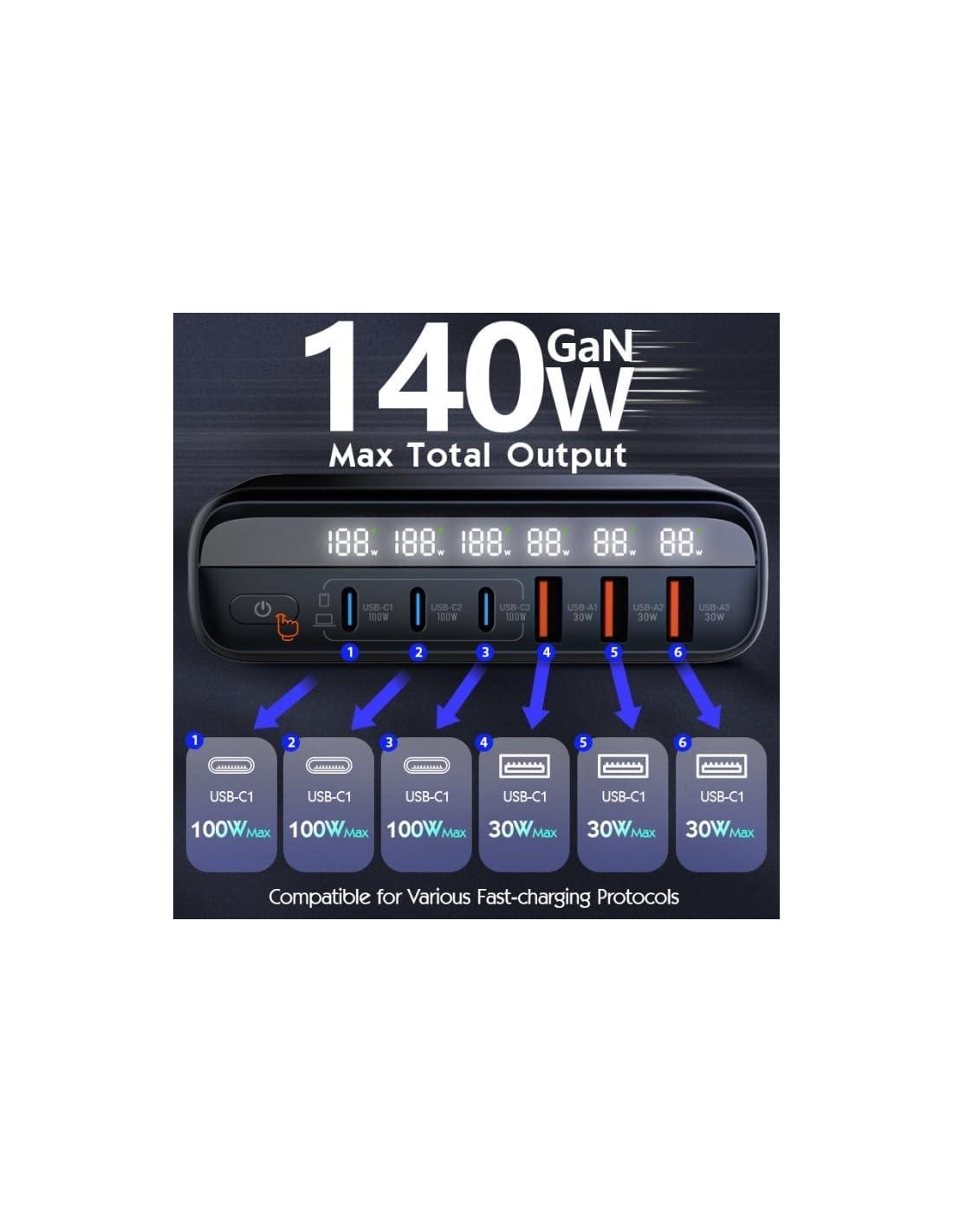- [Estación de carga super rápida de 140W] La estación de carga usb c GaN entrega un total de 140w de potencia. El puerto usb soporta protocolos avanzados PPS, PD3.0 y QC4.0. Este cargador usb multi puerto tiene un IC de control inteligente avanzado y un sistema de seguridad de multi-protección para garantizar la seguridad para ti y tus dispositivos.
