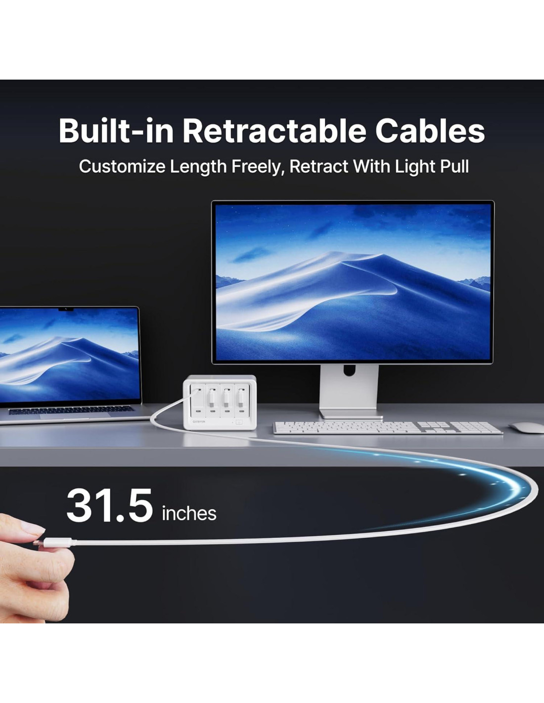 - Solución de Carga Todo-en-Uno: Revoluciona tu espacio de trabajo con 4 tomacorrientes de CA, 4 puertos USB-C, 3 cargadores Tipo-C retráctiles de 40W y 1 Cargador Lightning en un elegante hub. Alimenta laptops, teléfonos, tabletas, relojes inteligentes y más simultáneamente, eliminando la escasez de tomacorrientes y los cables enredados mientras maximizas la eficiencia de carga.