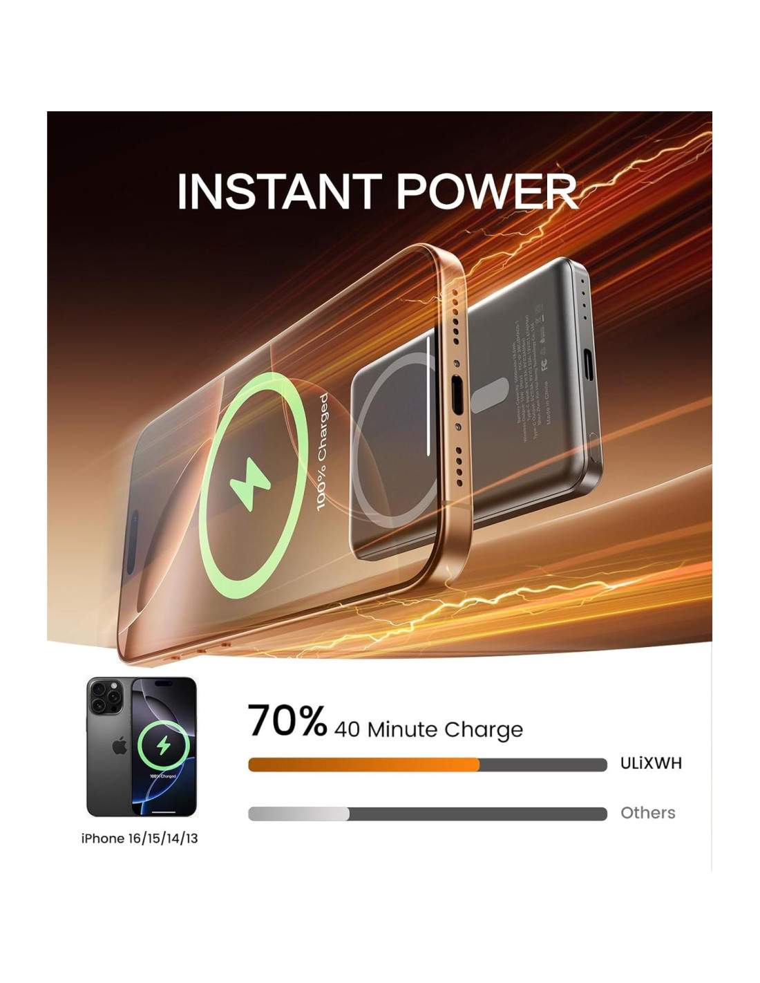 - Gestión avanzada del calor para carga segura - Mantente fresco y carga de manera más inteligente. Con tecnología de control de temperatura NTC, este cargador de batería portátil se mantiene hasta 50F (10C) más fresco que los cargadores portátiles convencionales para Magsafe. El banco de energía magnético para iPhone protege tu teléfono del sobrecalentamiento, incluso durante un uso intensivo o en climas cálidos, mientras asegura una salud óptima de la batería