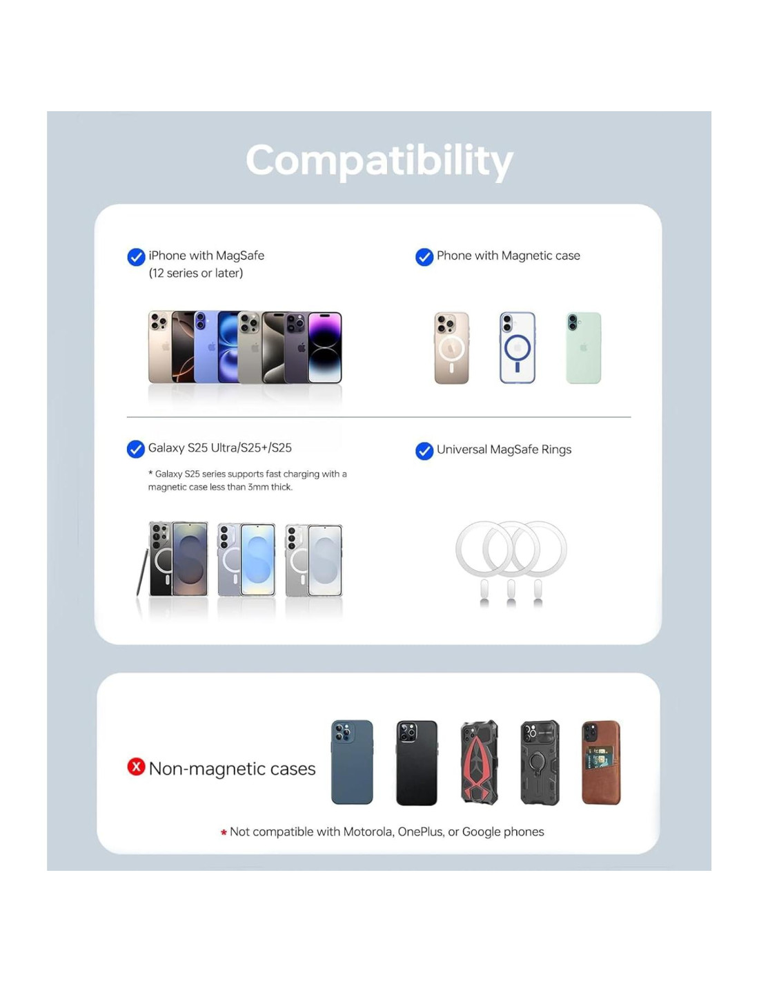 - Fuerte sujeción magnética - ¡Olvídate de los cables desordenados! Con una potente atracción magnética de 14N, este cargador inalámbrico para iPhone Magsafe se adhiere de forma segura a tu teléfono y se mantiene firmemente en su lugar, incluso durante el movimiento o el uso intensivo. Probado para soportar más de 3000 sacudidas, el cargador portátil para iPhone asegura una carga inalámbrica estable en cualquier momento y lugar
