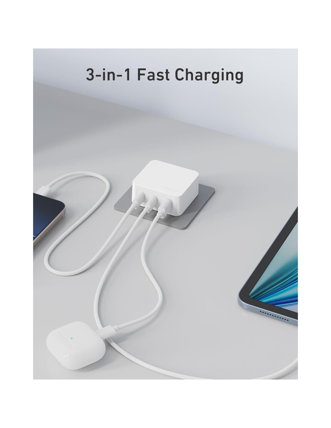 - Carga rápida para 3 dispositivos: Equipado con 2 puertos USB-C y 1 puerto USB-A, este bloque de cargador USB puede cargar rápidamente tu teléfono, iPad y auriculares simultáneamente. Conecta un solo dispositivo para cargar hasta 67W