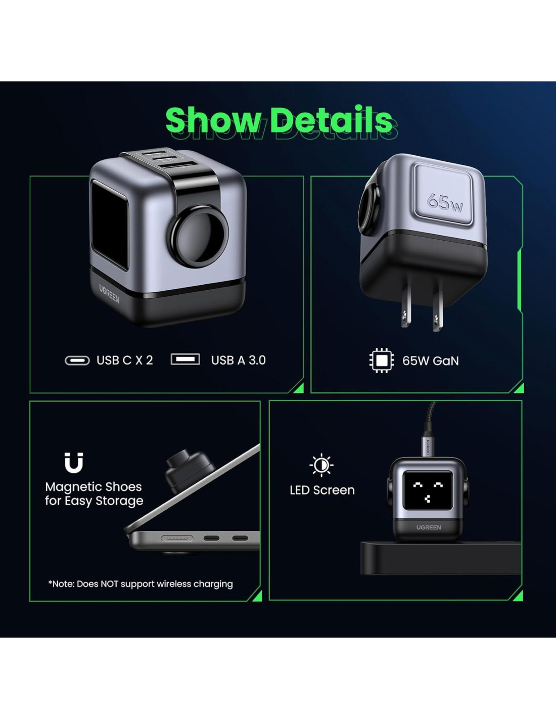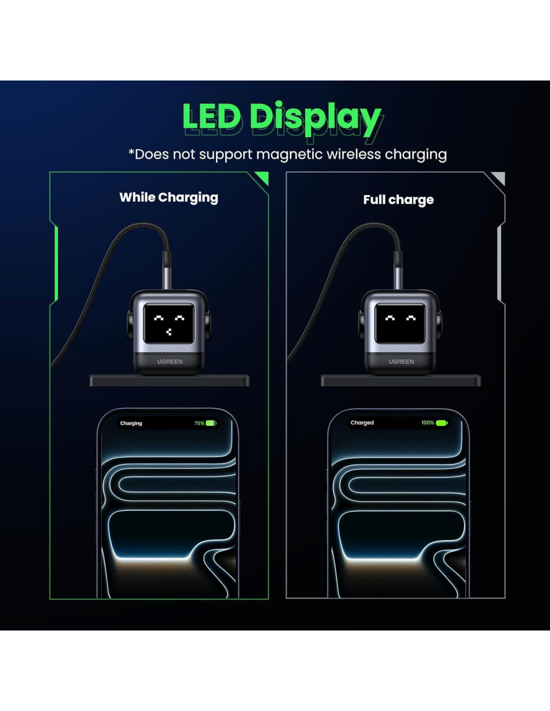 - Cargador UGREEN Uno: Cargador de la serie creativa de UGREEN, forma de robot, pantalla LED, mostrando diferentes expresiones interesantes según el estado de carga. Sus pies son magnéticos y se pueden pegar en el refrigerador o computadora sin perderse (Nota: La expresión solo aparecerá cuando la energía esté encendida)