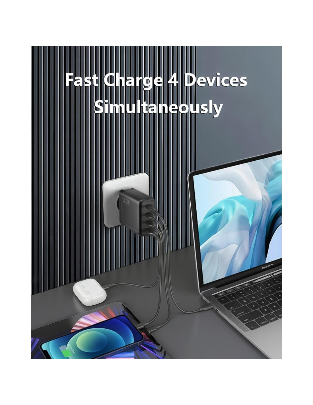 - Cargador Rápido 4-en-1 Presentando 2 USB-C (140W PD), 1 USB-C (30W PD) y 1 USB-A (22.5W QC), el cargador de pared ofrece una salida total de 140W Max, permitiendo la carga rápida de hasta cuatro dispositivos simultáneamente con una distribución eficiente de energía. Perfecto para teléfonos, tabletas y laptops. Cuando un solo dispositivo está conectado a uno de los puertos USB-C, disfruta de una carga impresionante de hasta 140W.