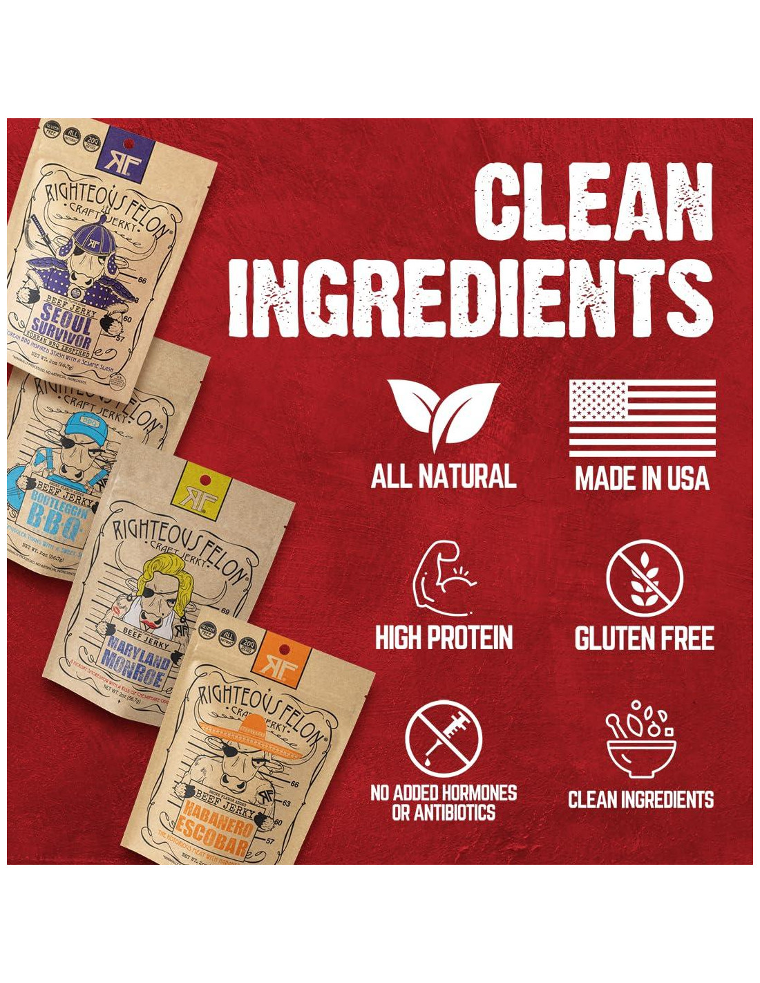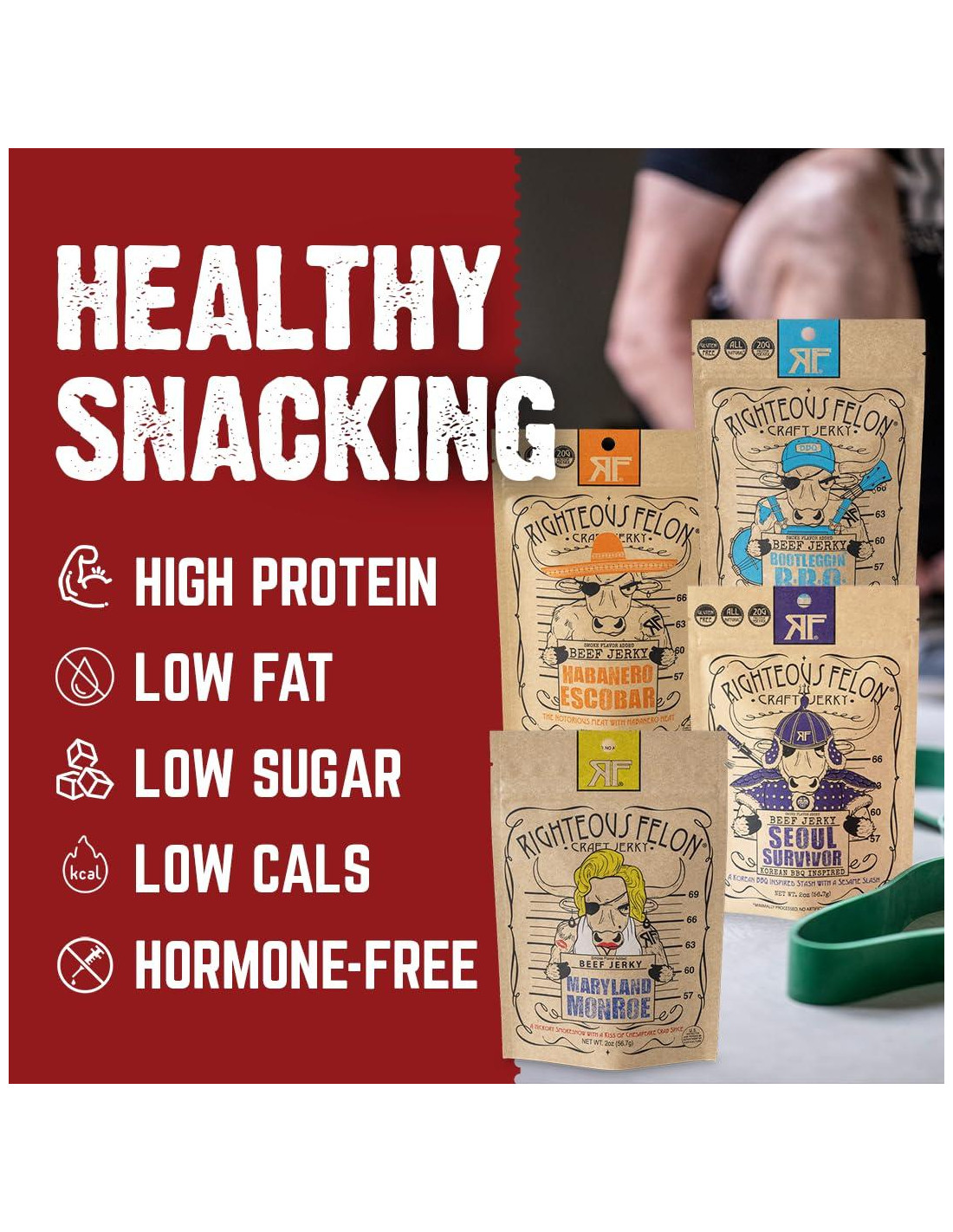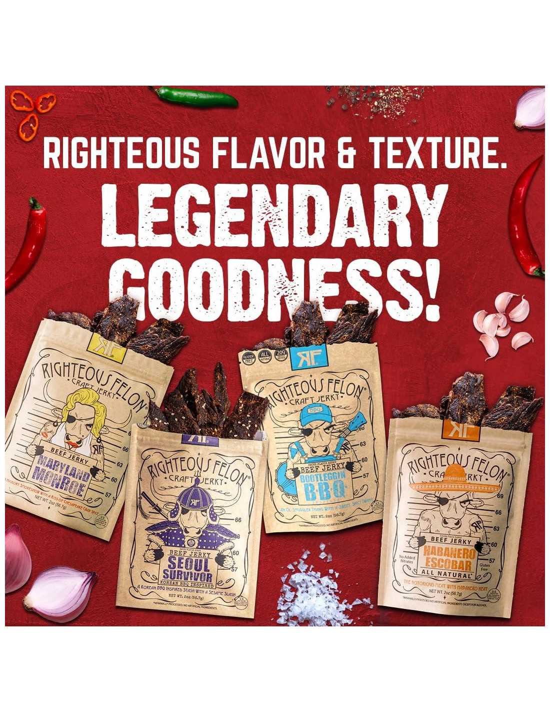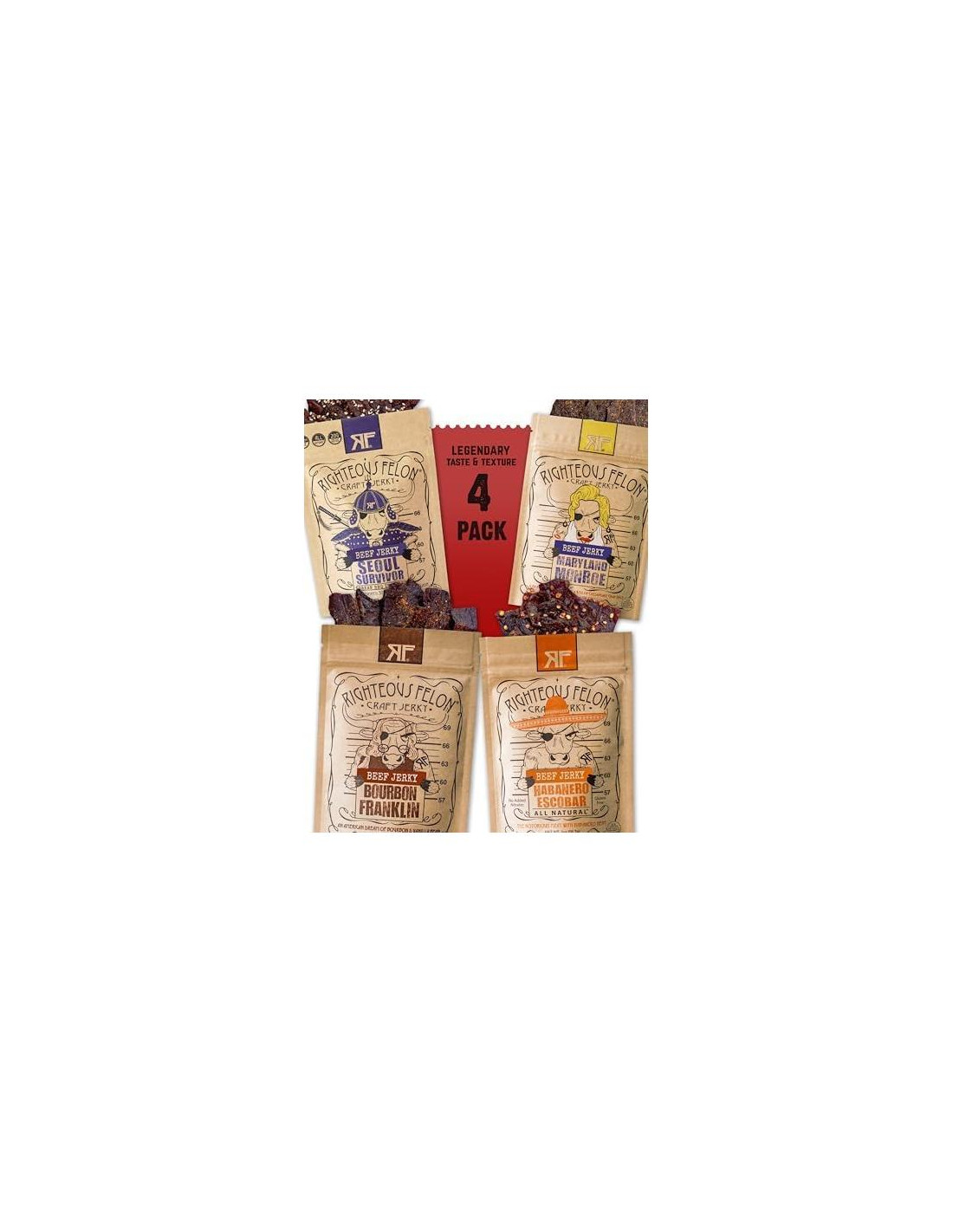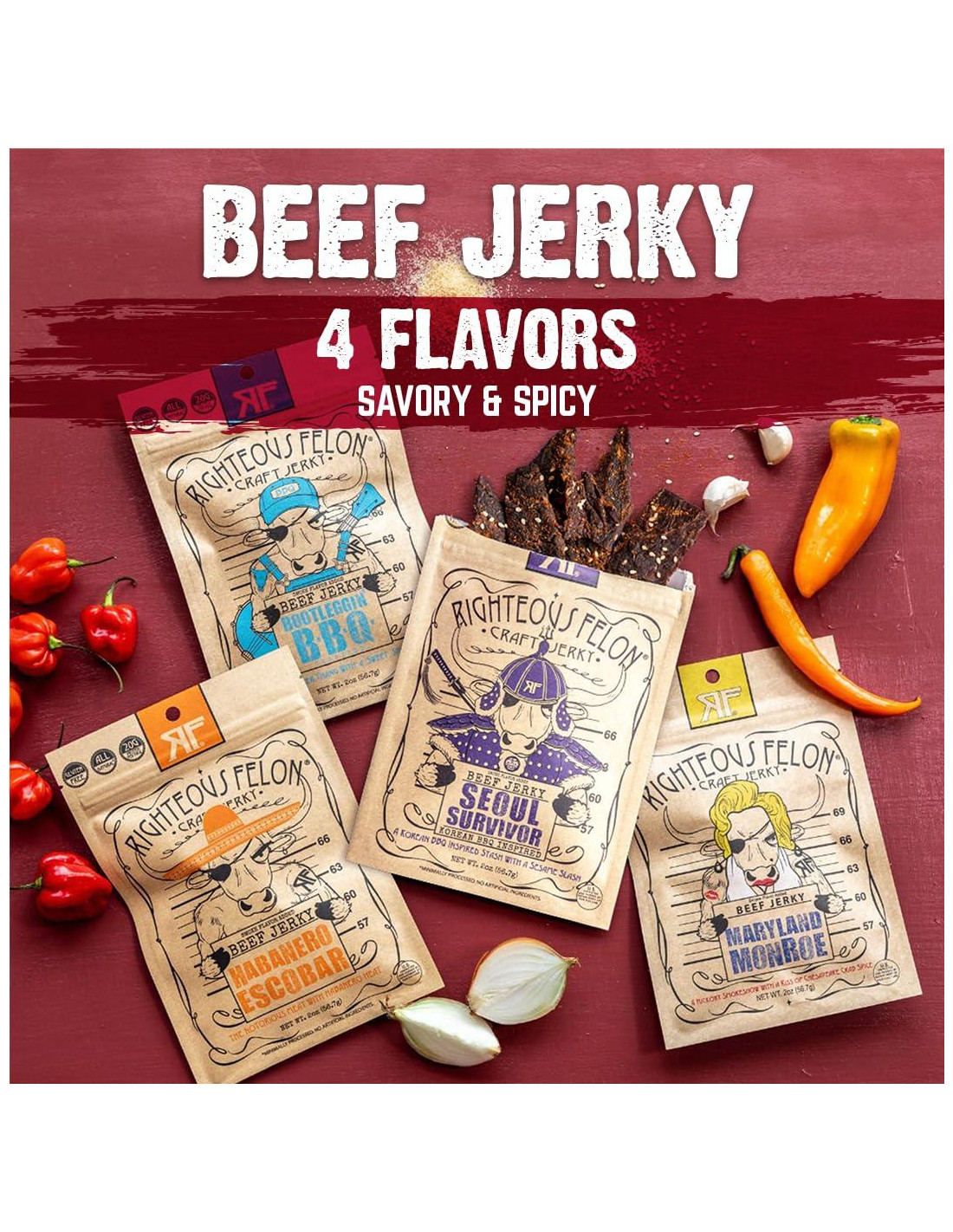 - Paquete de Variedad de Jerky Picante: Disfruta de una aventura picante con el Paquete de Variedad de Beef Jerky Picante Righteous Felon. Este paquete incluye cuatro sabores ardientes: Beef Jerky Habanero Escobar, Beef Jerky Bootleggin BBQ, Beef Jerky Maryland Monroe y Beef Jerky Seoul Survivor. Cada sabor ofrece un gusto único, perfecto para aquellos que aman los snacks audaces y picantes.