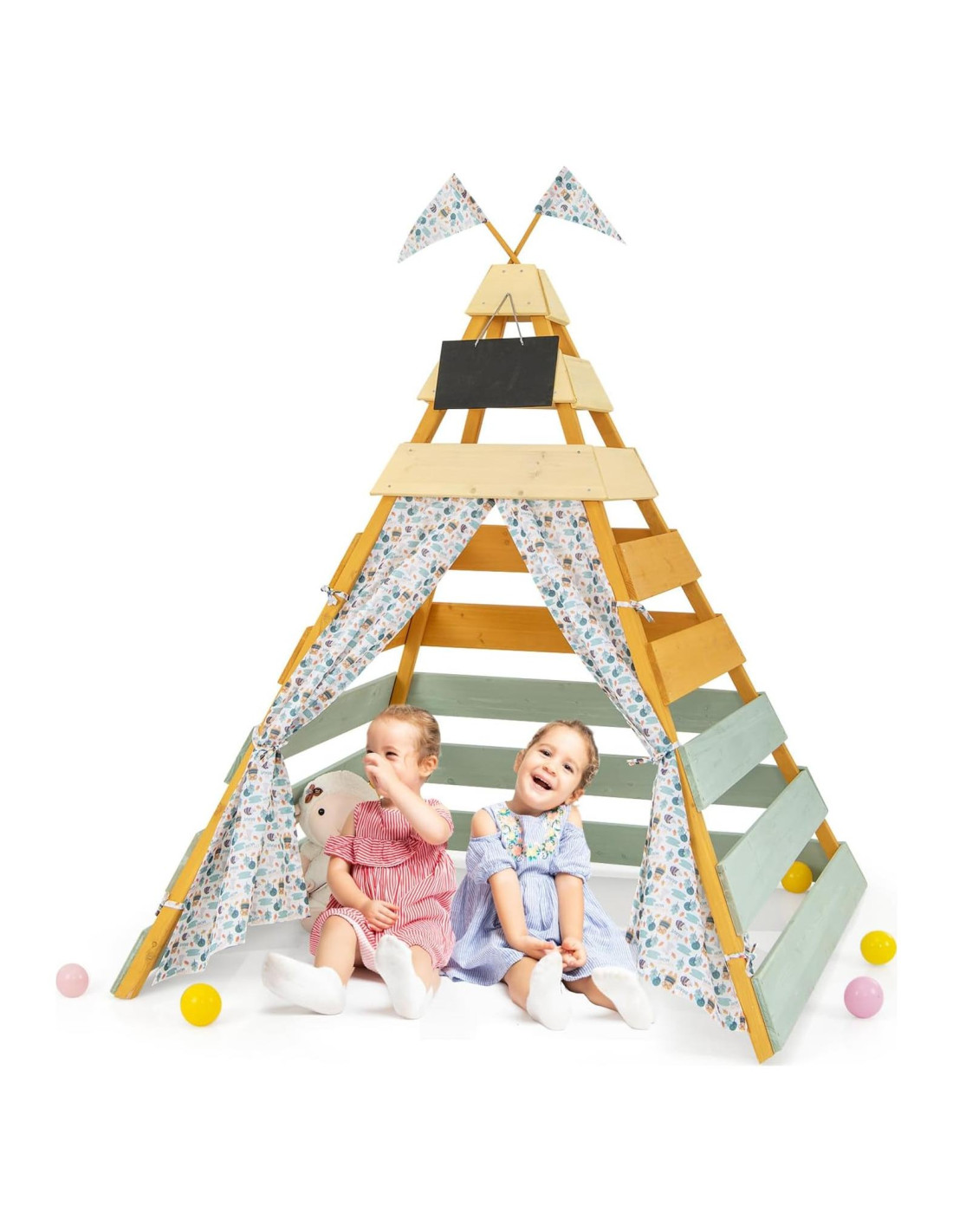 - [ Diseño Seguro y Confiable ]: Elaborado con madera de abeto resistente, esta carpa teepee de madera promete diversión duradera y proporciona un espacio seguro para las aventuras de los más pequeños. Además, la superficie sin astillas es segura para que los niños la usen. Y el diseño con listones promueve la circulación de aire.