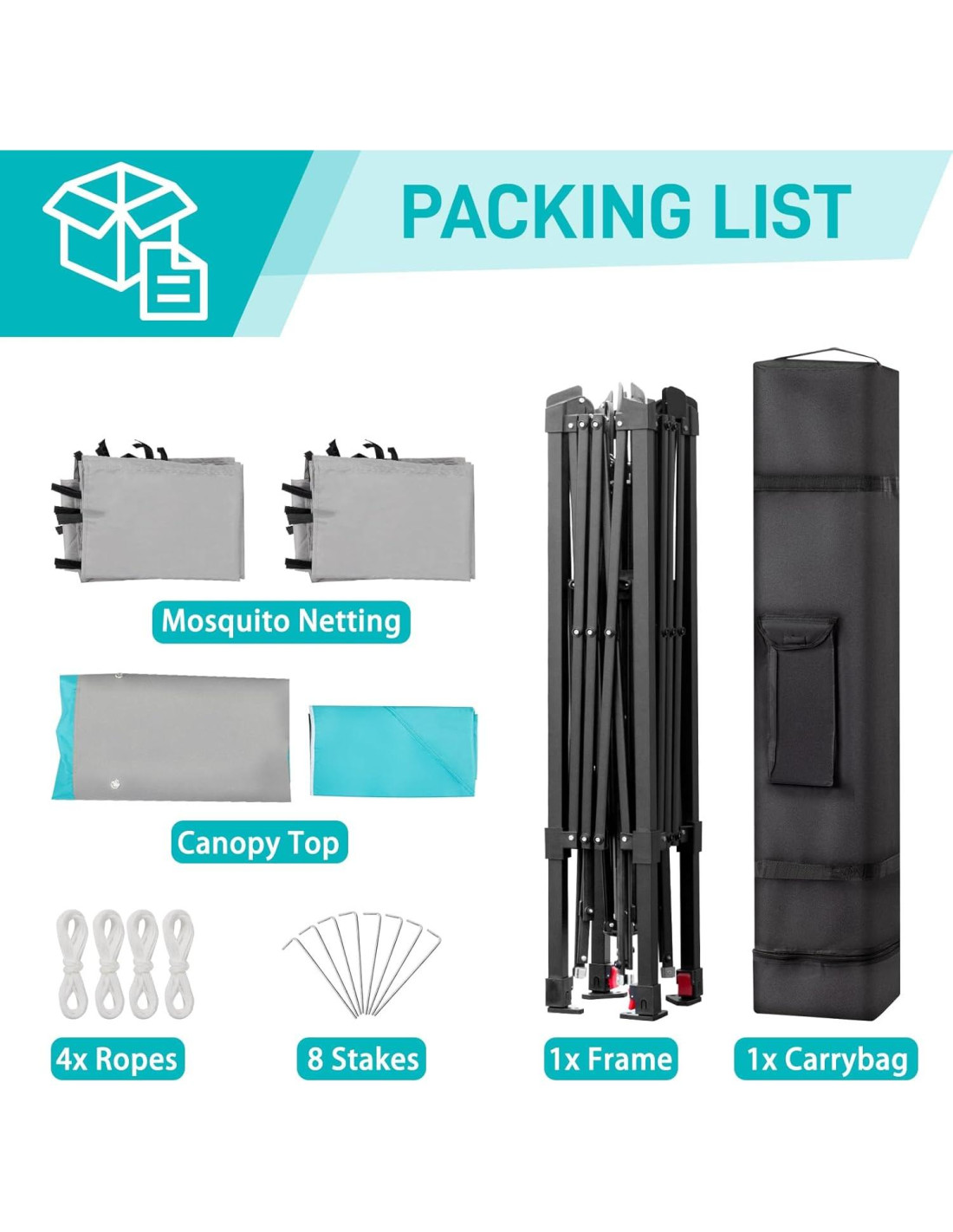 - Viene con una bolsa de transporte con ruedas para que pueda llevar fácilmente el conveniente gazebo desplegable a cualquier lugar como una solución rápida de cobertura solar. Viene con 4 bolsillos que se pueden usar como bolsas de peso o bolsas de supermercado.