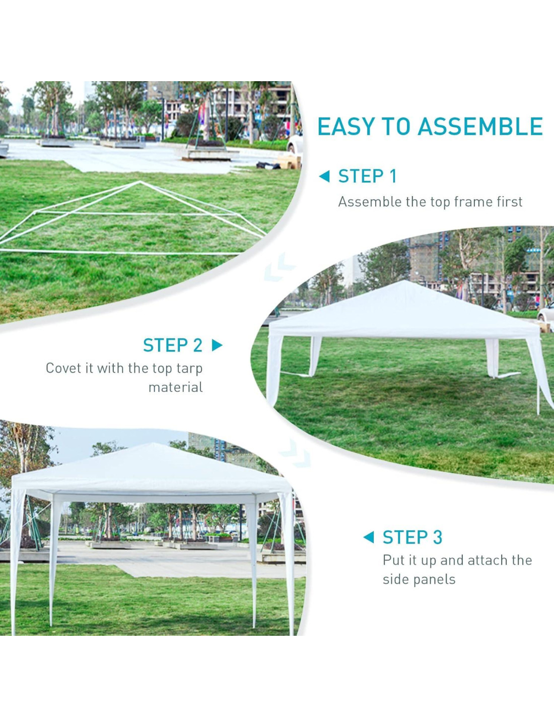 - MATERIALES SELECCIONADOS: La carpa está hecha de polietileno, que es resistente al agua y a los rayos UV. Y tiene un marco de acero recubierto de polvo blanco resistente a la corrosión y al óxido para garantizar la robustez y estabilidad de la carpa blanca. La carpa de 10x10 está equipada con estacas para tierra y cuerdas para mayor estabilidad. Perfecta para cenas familiares y bodas.