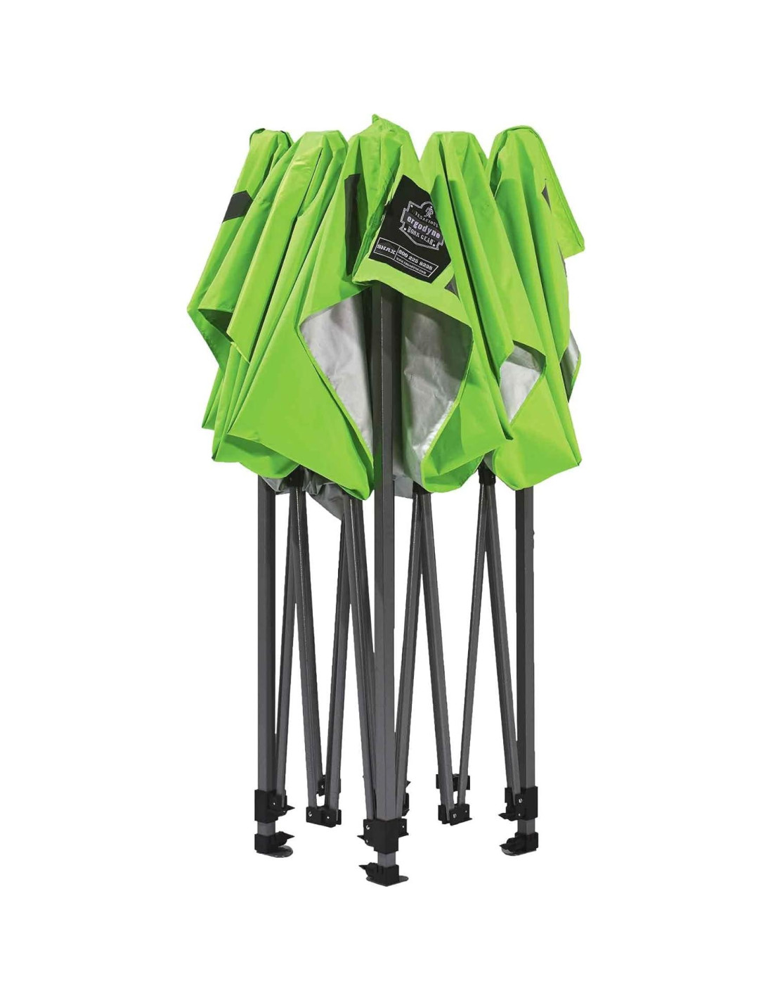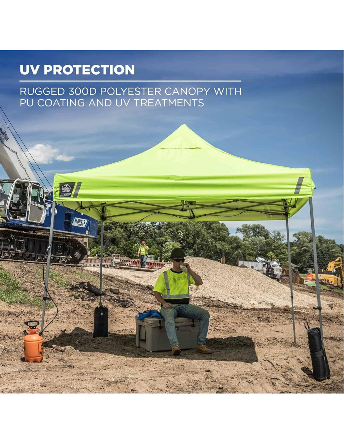 Descripción del Producto La Carpa Plegable Resistente SHAX 6000 - 10x10 es un refugio instantáneo duradero que proporciona alivio rápido y duradero del sol, viento y lluvia, con una huella de 10ft x 10ft / 3m x 3m. El marco de acero con recubrimiento en polvo está diseñado para resistir las inclemencias del tiempo y no se doblará ni oxidará fácilmente como el aluminio. Los deslizadores de plástico ABS en las patas ajustables son más duraderos y fáciles de ajustar en comparación con otras carpas que tienen pasadores. Esta carpa portátil ofrece tres alturas diferentes que varían de 10ft a 14ft / 3m a 4m. Hecha con material de poliéster de 300 deniers de alta calidad, esta carpa resistente de 10 x 10 también cuenta con un recubrimiento de poliuretano impermeable (PU) y tratamientos UV, así como esquinas reforzadas para soportar condiciones difíciles. Un techo de doble ventilación permite un flujo de aire máximo, mientras que una opción de color lima de alta visibilidad y un recubrimiento reflectante en el interior proporcionan mayor visibilidad en sitios de trabajo ocupados o en eventos. Se incluye una bolsa con ruedas conveniente para un fácil almacenamiento y transporte junto con cuatro estacas de acero para el suelo y cuatro cuerdas de nylon que se pueden usar para mayor estabilidad. Esta carpa plegable está diseñada principalmente para ser una carpa de trabajo en sitios de trabajo para ayudar a prevenir enfermedades relacionadas con el calor, pero también se puede usar para eventos interiores o exteriores. Es ideal para eventos deportivos, bodas, fiestas de cumpleaños o cualquier otro evento que necesite protección del sol y la lluvia. Del Fabricante Los Refugios de Trabajo Portátiles SHAX proporcionan alivio de la lluvia, el viento y los temidos rayos UV del sol. Sus diseños duraderos ofrecen refugio instantáneo sin importar dónde estés. Diseñados pensando en el sitio de trabajo, no en el patio trasero. Los marcos de acero con recubrimiento en polvo proporcionan resistencia a la corrosión, mientras que los recubrimientos UV y PU en la resistente cubierta de poliéster brindan una protección adecuada contra las inclemencias del tiempo. Mantén a tus trabajadores seguros y productivos en todas las condiciones.