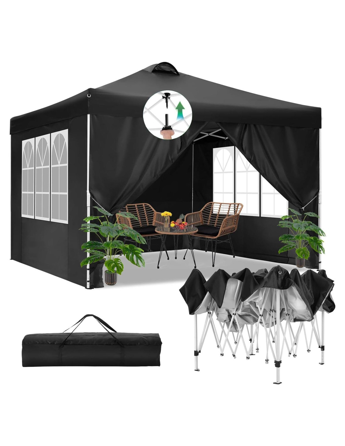 - [Ventilación] carpa de dosel 10x10 con paredes laterales tiene una ventilación en la parte superior, que ayuda a la circulación del aire dentro de la carpa. Y la parte superior está recubierta de plata para bajar la temperatura dentro del gazebo plegable en el caluroso verano.