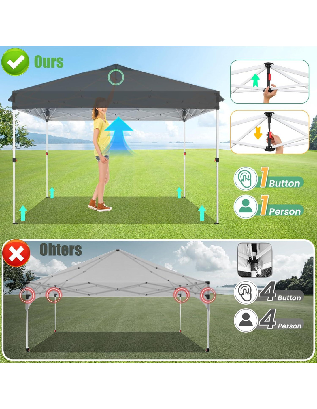 - [Fácil de montar] carpa plegable 10x10 adopta una estructura de plegado integrada, por lo que solo necesita de 1 a 2 personas para completar toda la instalación en solo unos minutos sin ninguna otra herramienta.