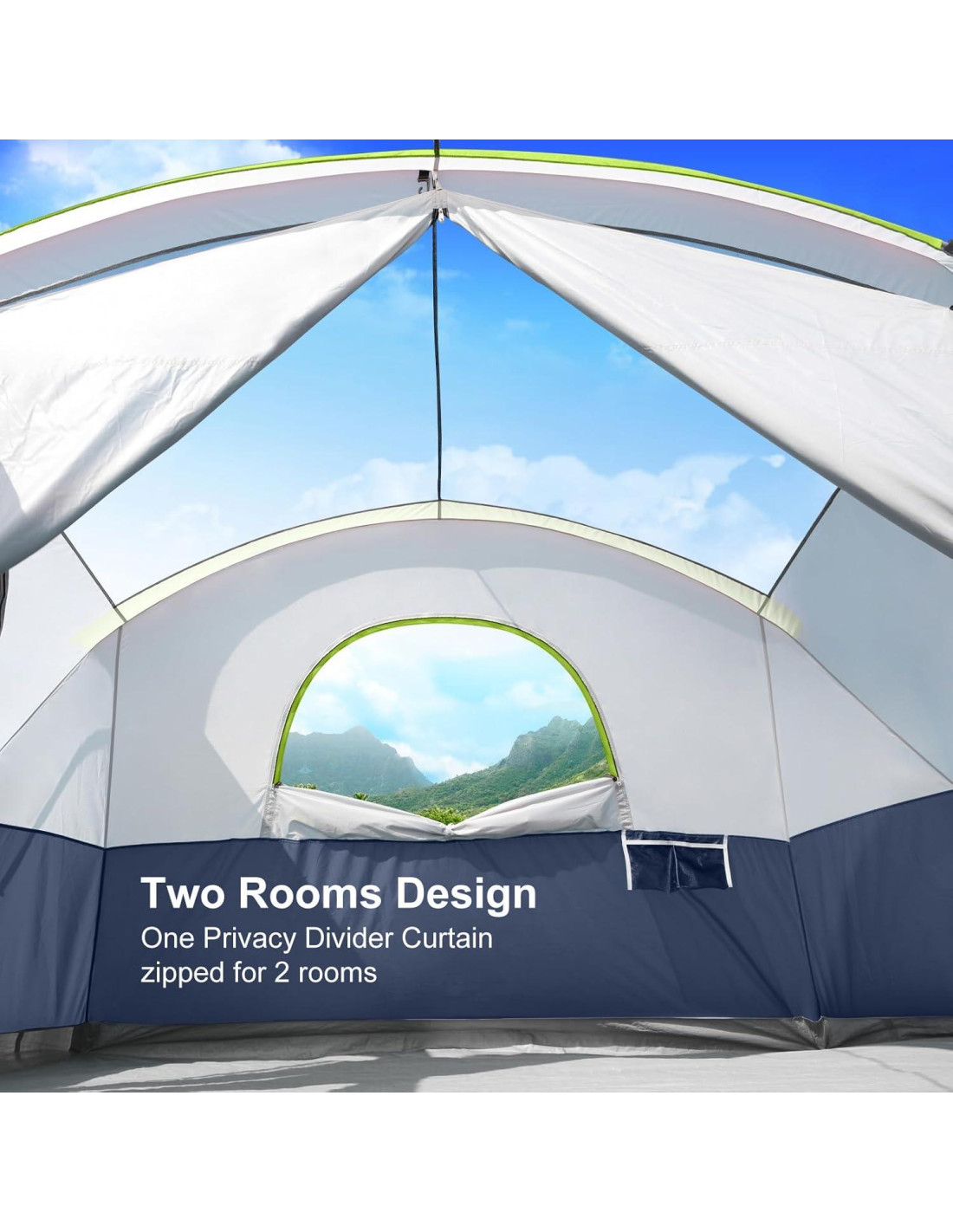 - Visibilidad y Ventilación: La tienda de camping tiene 2 grandes puertas de malla, 5 ventanas de malla y parte superior de malla. También podrías disfrutar de una noche de cine proyectando en la cortina dividida.