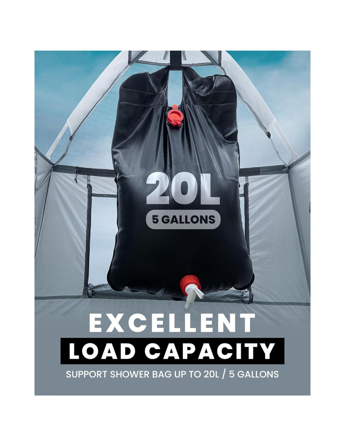 - Duradero, Excelente Capacidad de Carga - Esta carpa de ducha está hecha de poliéster 190T. El techo removible, fabricado de poliéster PU2000mm, previene efectivamente la entrada de agua a la carpa y proporciona sombra solar. La estructura optimizada y el gancho superior duradero pueden soportar efectivamente bolsas de ducha de hasta 20L (5 Galones), ofreciendo una buena experiencia de ducha. (Vejiga y Baño Portátil No Incluidos)
