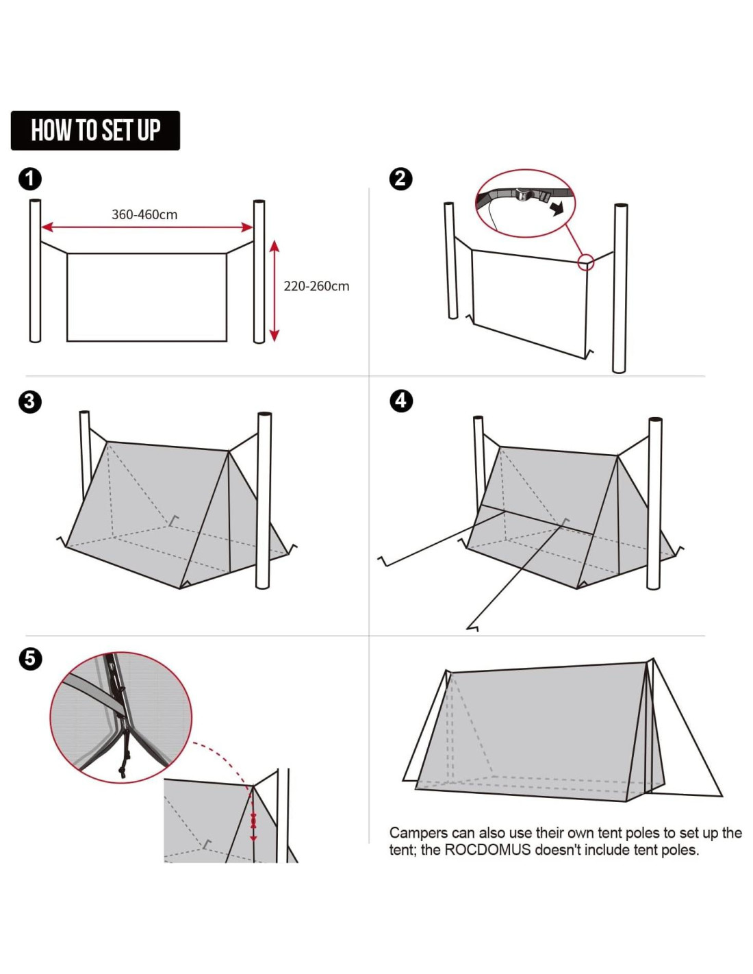 - Mide 11.15 pies * 7.9 pies * 6.2 pies (340 cm * 240 cm * 190 cm) para adaptarse a todas las hamacas de tamaño estándar, también se puede usar como una carpa de marco con sus propios postes o palos, o 2 camas de camping con estufa de carpa más sillas