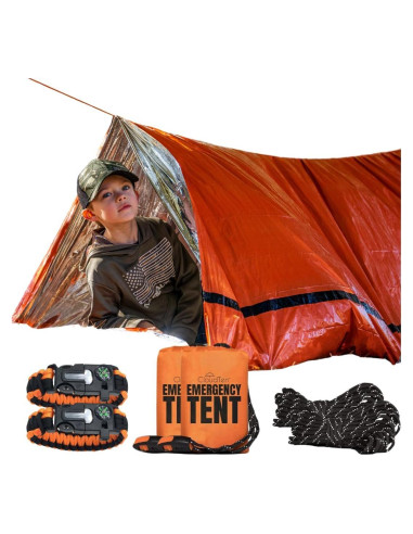 - Componentes incluidos: Tienda de Supervivencia de Emergencia Naranja, Bolsa de Nylon con Cuerda de Ajuste y Silbato de Supervivencia, Pulsera de Supervivencia Multifuncional de Paracord