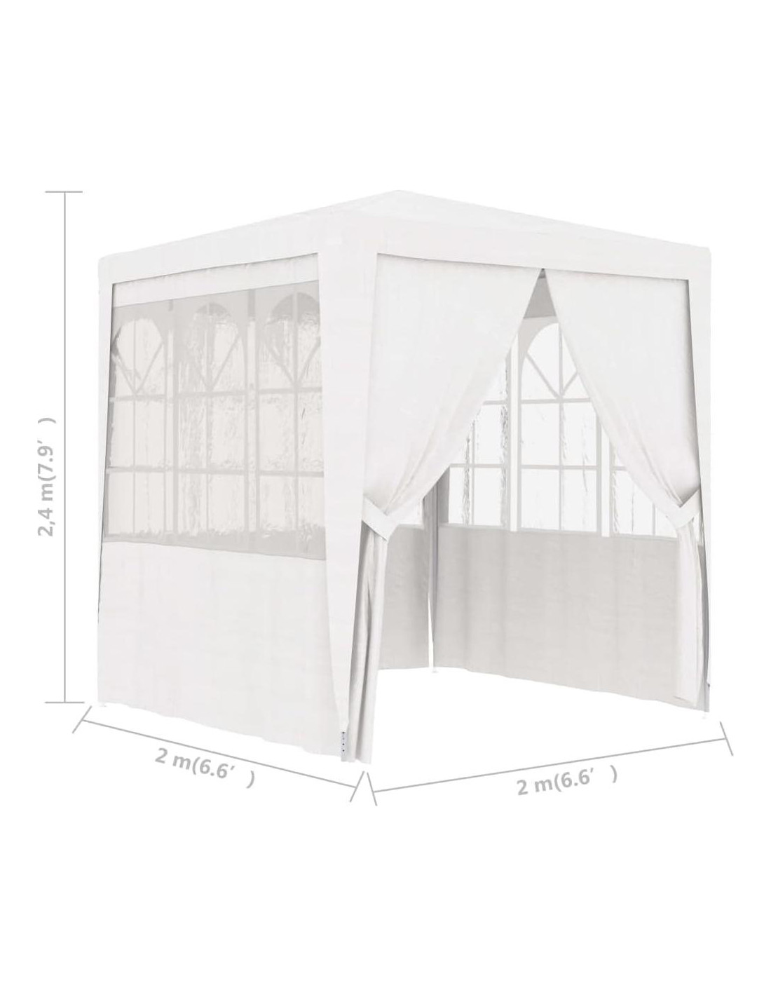 - Color: Blanca Material: 90 g/m PE (100% polietileno), acero Dimensiones: 2.01 m x 2.01 m x 2.41 m (L x A x H) Altura del alero desde el suelo: 2.01 m Con paredes laterales Resistente a UV y agua Materiales de montaje incluidos: Sí