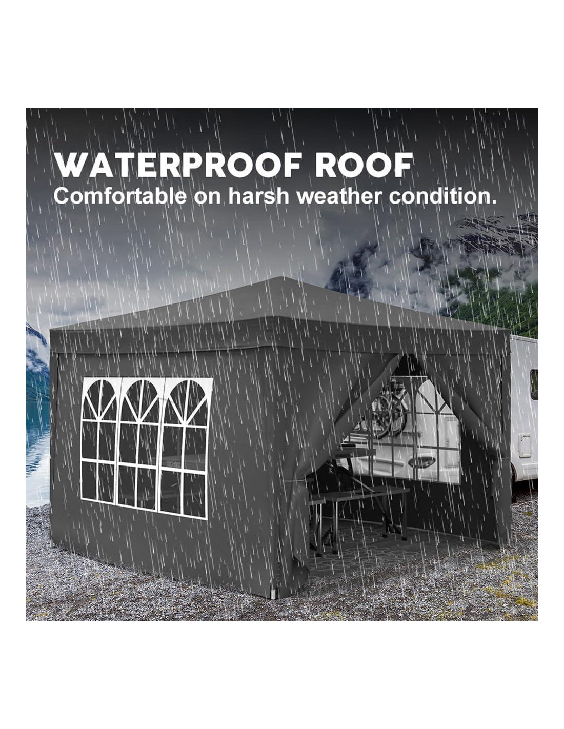- Duradera y Protectora: Construida con tela impermeable y un marco de acero resistente, esta carpa bloquea el 99% de los dañinos rayos solares y soporta condiciones climáticas ligeras a moderadas, asegurando que tu evento transcurra sin problemas.