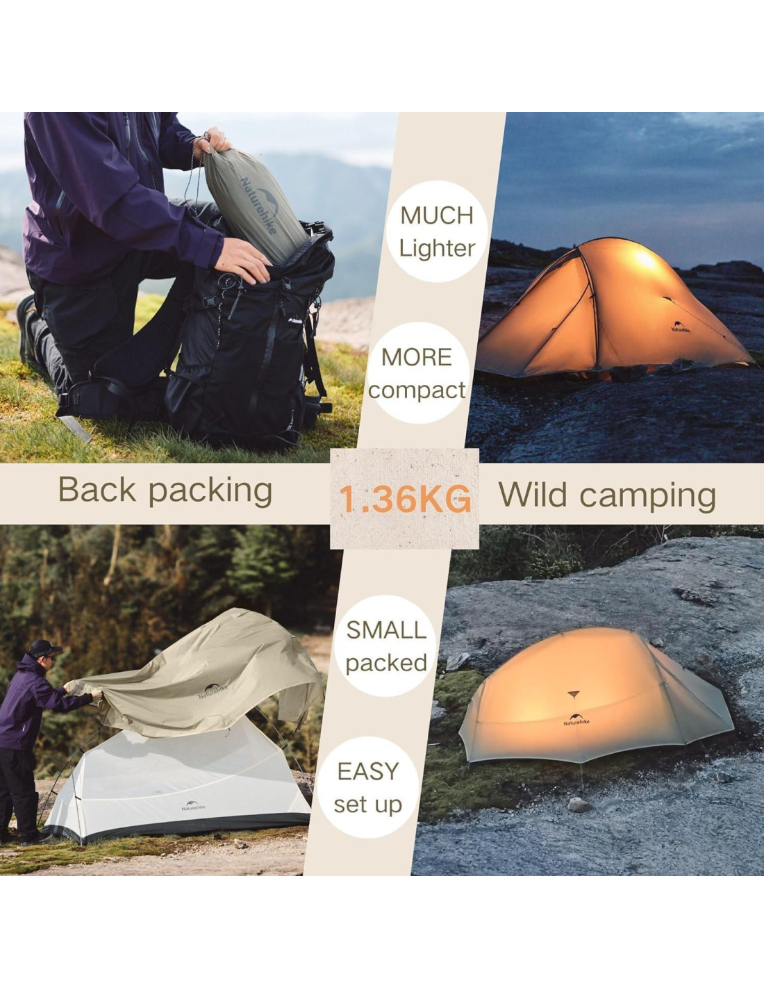 - Tienda de 3 Temporadas: Las Tiendas Ultraligeras también se pueden usar para un viaje de camping salvaje en solitario. Construcción autosoportada doble 'Y', tienda sólida que es independiente. Viene con postes de aluminio de muy alta calidad que se ensamblan de manera suave. Las estacas son muy ligeras pero resistentes, para fortalecer la estructura en el viento. Puede funcionar bien en condiciones ventosas, ¡resistiendo vientos fuertes!