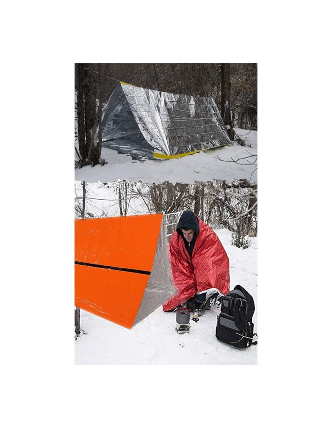 - [Características de la Tienda de Vida para 2 Personas] En clima cálido, la tienda debe ser montada con el lado plateado hacia afuera para reflejar el calor, este ajuste ayudará a mantener una temperatura interior más fresca, previniendo golpes de calor. Cuando el clima es frío o nevado: el lado plateado hacia adentro ofrece una protección superior en condiciones frías, el revestimiento aislante refleja el 91% del calor corporal, proporcionando calor y comodidad óptimos en frío extremo.