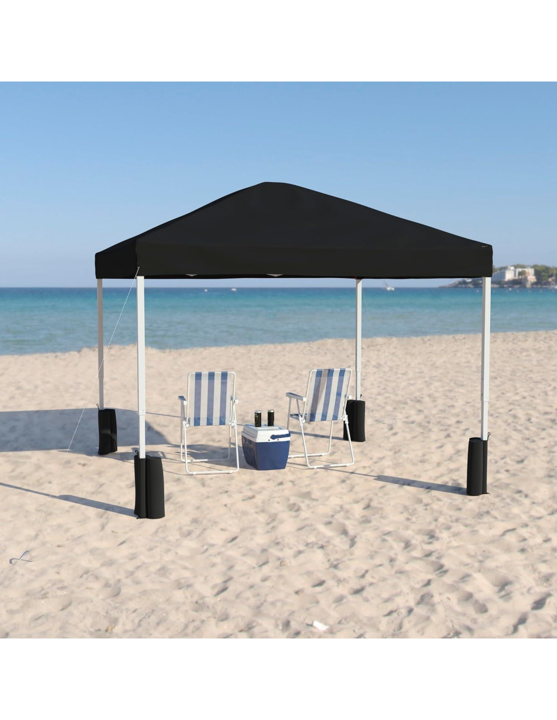Los refugios portátiles son una excelente manera de proporcionar sombra durante eventos al aire libre y esta carpa plegable negra para todo clima de 10' x 10' te ayudará a mantenerte alejado de los elementos para que puedas disfrutar de tu tiempo con familiares y amigos. La parte superior de poliéster resistente a la intemperie tiene esquinas reforzadas para evitar desgarros y está recubierta con UV para resistir la decoloración por los rayos del sol. Simplemente despliega la parte superior de tela, sujétala al marco superior con los sujetadores de gancho y bucle, extiende las patas inferiores y ábrela para una protección instantánea. La fuerza y durabilidad abundan en esta carpa instantánea. El marco de acero recubierto de polvo blanco es resistente a la oxidación y la corrosión y se bloquea en su lugar con un mecanismo de bloqueo "sin pellizcos". El marco ajustable en altura te lleva desde el patio trasero hasta la playa y en todas partes entre medio. Asegura los sacos de peso incluidos a las patas inferiores y luego llénalos con arena (no incluida) para garantizar la máxima estabilidad. Esta carpa plegable se pliega cuando no está en uso y tiene su propio estuche con ruedas para un fácil transporte y almacenamiento. Esta carpa de sombra rápida incluye el marco, la parte superior de la carpa, estacas de tierra estabilizadoras, sacos de peso y un estuche de almacenamiento con ruedas. El ensamblaje toma menos de 10 minutos y no requiere herramientas. Lleva esta carpa de sombra portátil en viajes de campamento, tailgating, los juegos de fútbol de los niños o para reuniones en tu patio o en el jardín. Esta carpa para fiestas se verá genial temporada tras temporada.