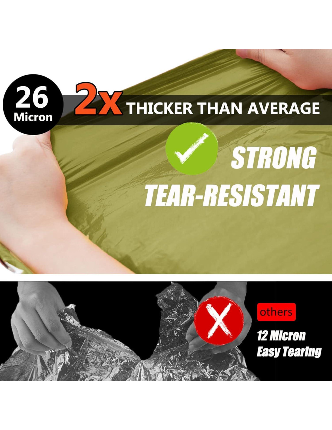 - 2X Más Gruesa que el Promedio: Hecha de polietileno resistente a desgarros de 26um, esta carpa está diseñada para resistir viento, lluvia y nieve. Puede retener más del 90% de tu calor corporal, manteniéndote caliente y protegido incluso en frío extremo