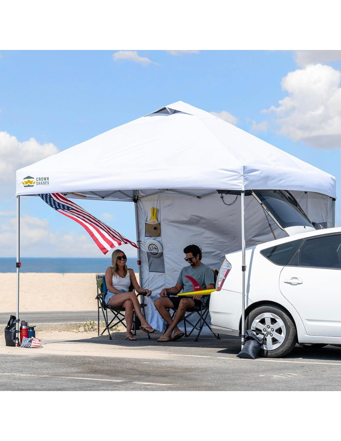 - ESPACIOSA Y COMPACTA - Con una huella de carpa de 10' x 10', esta carpa proporciona 100 pies cuadrados de sombra, acomodando cómodamente hasta 10 personas. La altura interior supera los 9 pies (2.74 m), y la altura máxima bajo el voladizo es de más de 6 pies (1.83 m). Cuando está empacada, las dimensiones son 45" x 8.5" x 8.5" (114.3 cm x 21.6 cm x 21.6 cm), encajando perfectamente en el maletero de su vehículo. La altura libre se mejora por la ausencia de travesaños superiores, ofreciendo más amplitud en comparación con diseños tradicionales, haciéndola ideal para fiestas al aire libre.