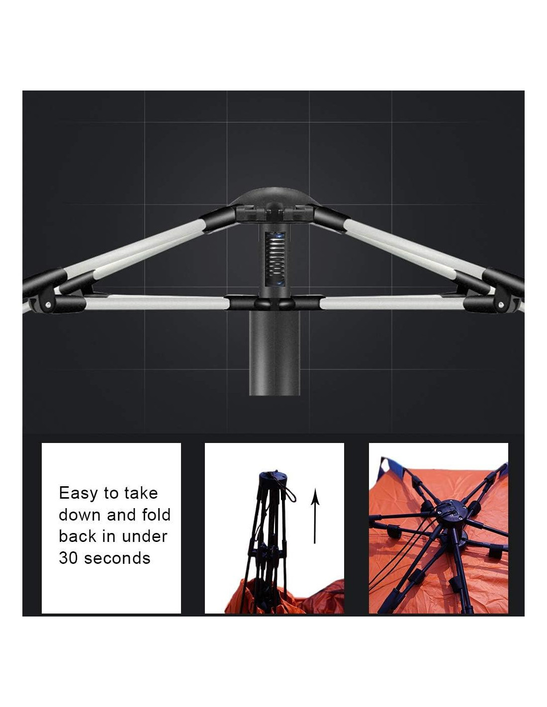 Esta carpa de playa instantánea cuenta con un mecanismo automático patentado de pop up, lo que hace que sea rápido y fácil de desmontar y plegar en menos de 30 segundos.