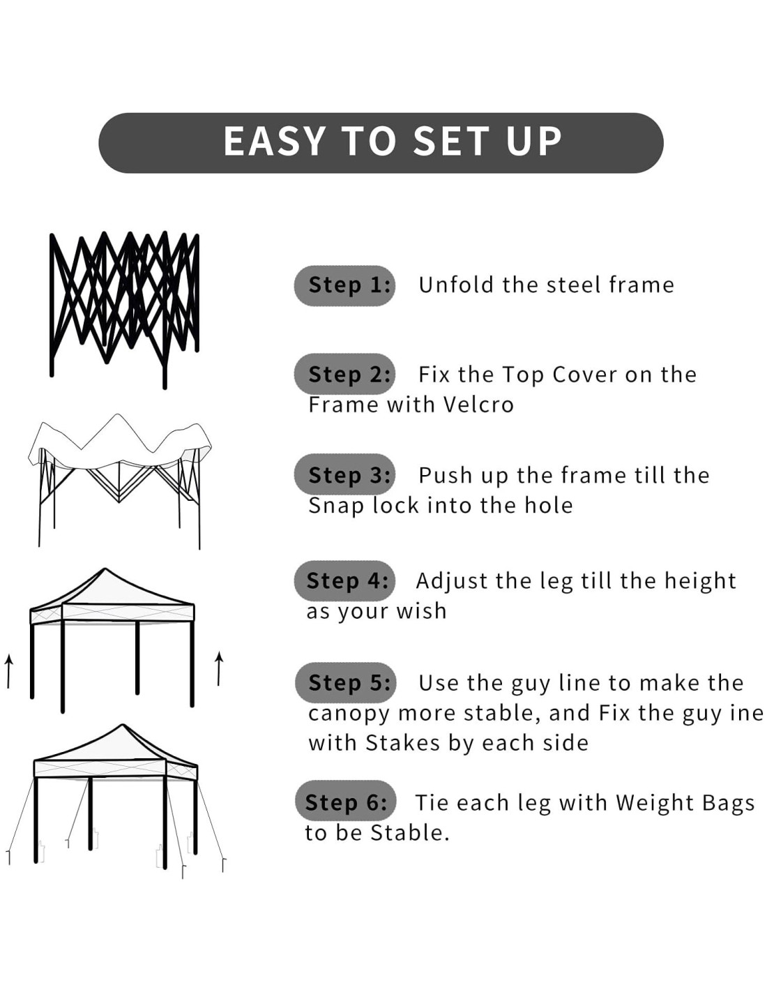 - PAQUETE: Incluye Estructura de Carpa Instantánea de 10x10, Cubierta Superior de Carpa, Bolsa Duradera con Ruedas, 8 Estacas, 4 Cuerdas de Sujeción.