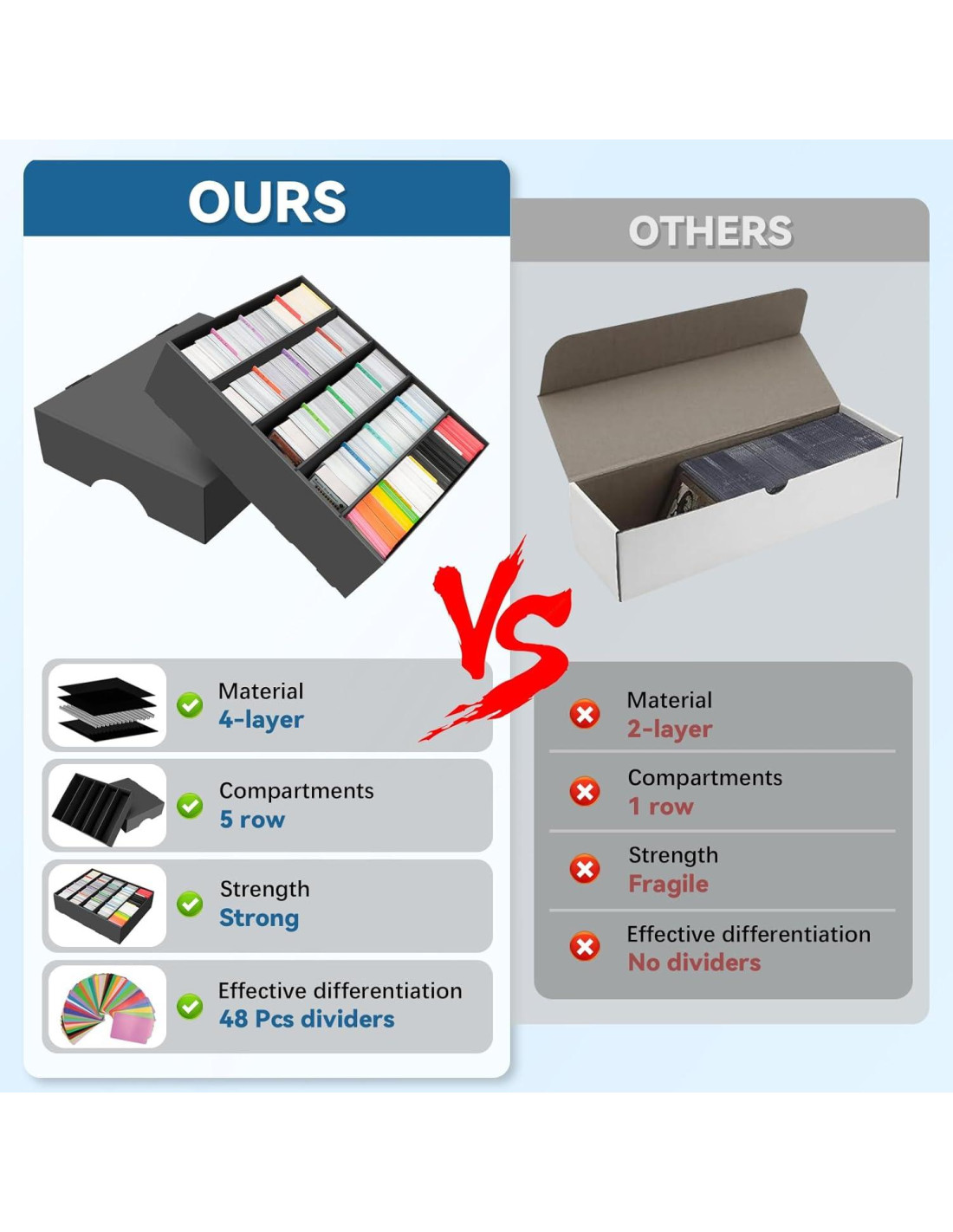 - Cada Caja de Cartas Almacena 4650+ Cartas Sin Fundas. Obtendrás 4 cajas de almacenamiento de cartas de intercambio, cada bandeja de clasificación de cartas de gran capacidad tiene 5 compartimentos, diseñada para un almacenamiento de clasificación conveniente. Cada compartimento de la caja de almacenamiento de cartas sostiene 930 cartas sin fundas, 460 cartas con doble funda o 550 cartas de juego con funda simple. Cada caja para cartas deportivas sostiene un total de 4650 cartas sin fundas, 2300 cartas con doble funda o 2750 cartas de juego con funda simple. NO son adecuadas para fundas de carga superior y soportes magnéticos.