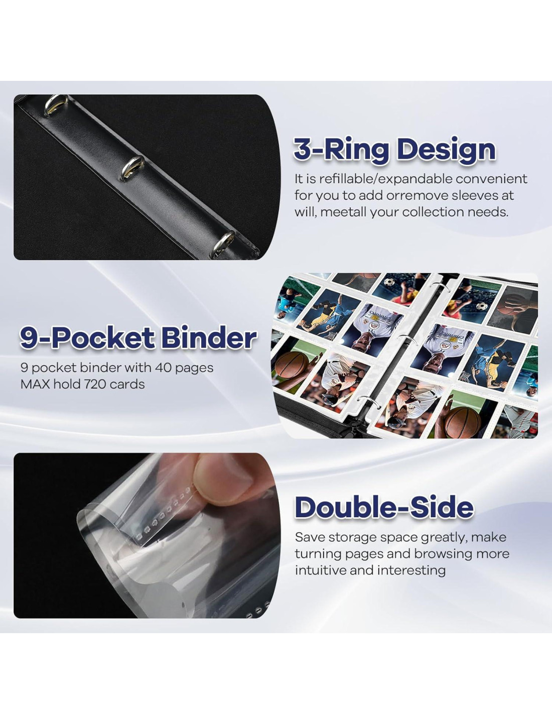 - [Exhibición Completa y Gran Capacidad de Almacenamiento] ¡Aguanta hasta 720 cartas coleccionables! Tu colección merece la grandeza de posibilidades ilimitadas. 40 piezas de fundas removibles de excelentes páginas transparentes de 9 bolsillos (doble cara). El bolsillo transparente te permite ver cada detalle de la carta claramente, sin sacarla, y mantener tus preciadas cartas coleccionables organizadas y en excelente estado. El diseño de 3 anillos es conveniente para que agregues o quites fundas a voluntad, satisfaciendo todas tus necesidades de colección.