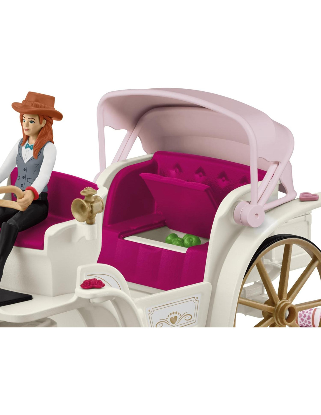 Emily se ve adorable en su vestido de novia. El novio Toby también se ha vestido. Juntos suben a la carroza de boda, a la que están atados un montón de latas vacías que suenan. Hanna ha decorado el Lipizzaner y la carroza para que todo se vea festivo. El caballo lleva vendas con corazones y el freno también está decorado con corazones. La pareja de novios se acomoda en cojines en forma de corazón en la carroza y brindan entre sí con champán. ¿Qué es esto? ¡Hay un compartimento secreto escondido debajo del asiento! Hay algunas manzanas guardadas para más tarde, para que el Lipizzaner pueda ser recompensado por su arduo trabajo.