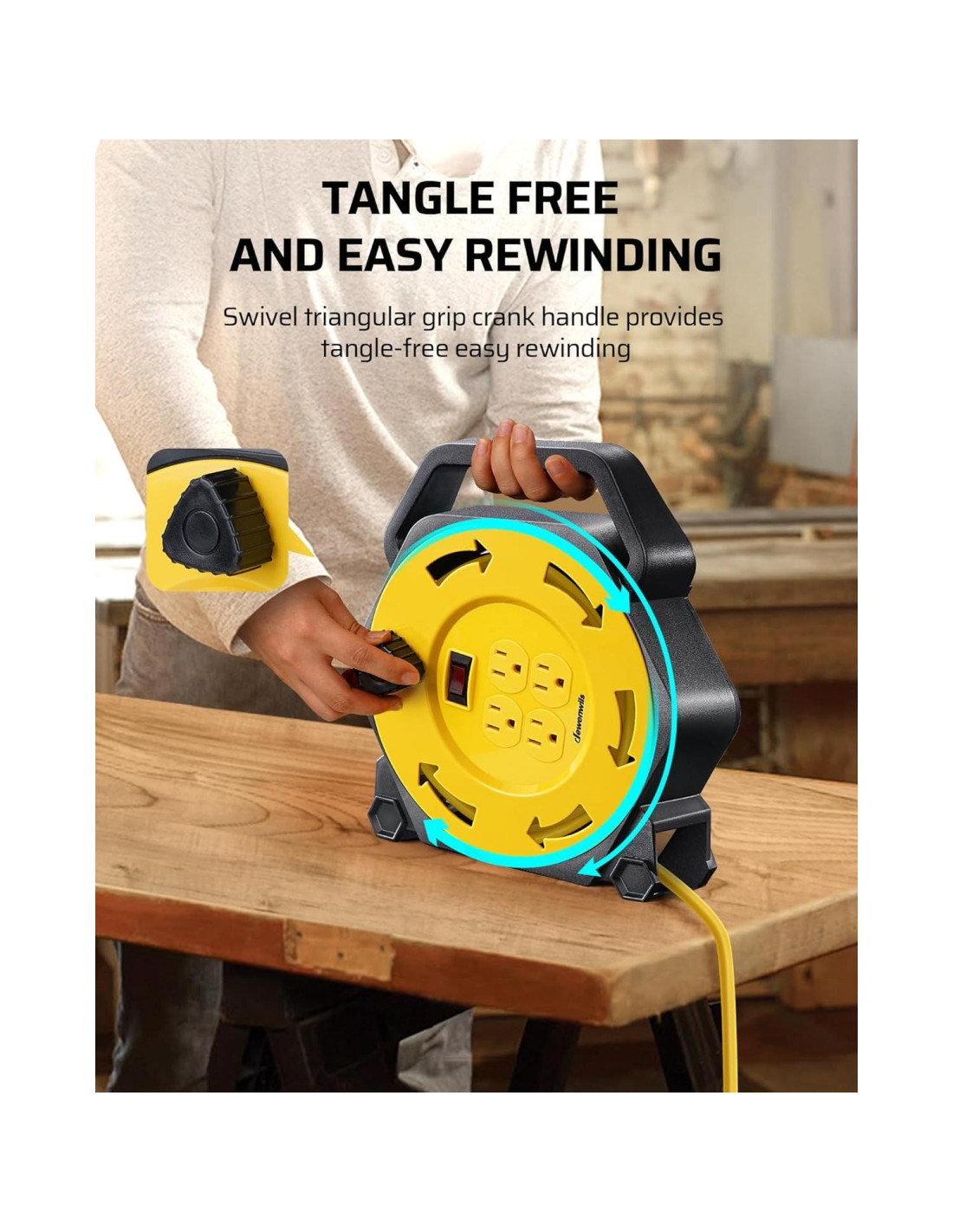 - [ Fácil de Enrollar y Desenrollar ] El enrollador de cable de extensión cuenta con un mango de manivela triangular giratorio para un enrollado fácil y sin enredos; ayuda a enrollar el cable de poder fácilmente en el carrete de cable eléctrico y mantener los cables ordenados y limpios para el próximo uso