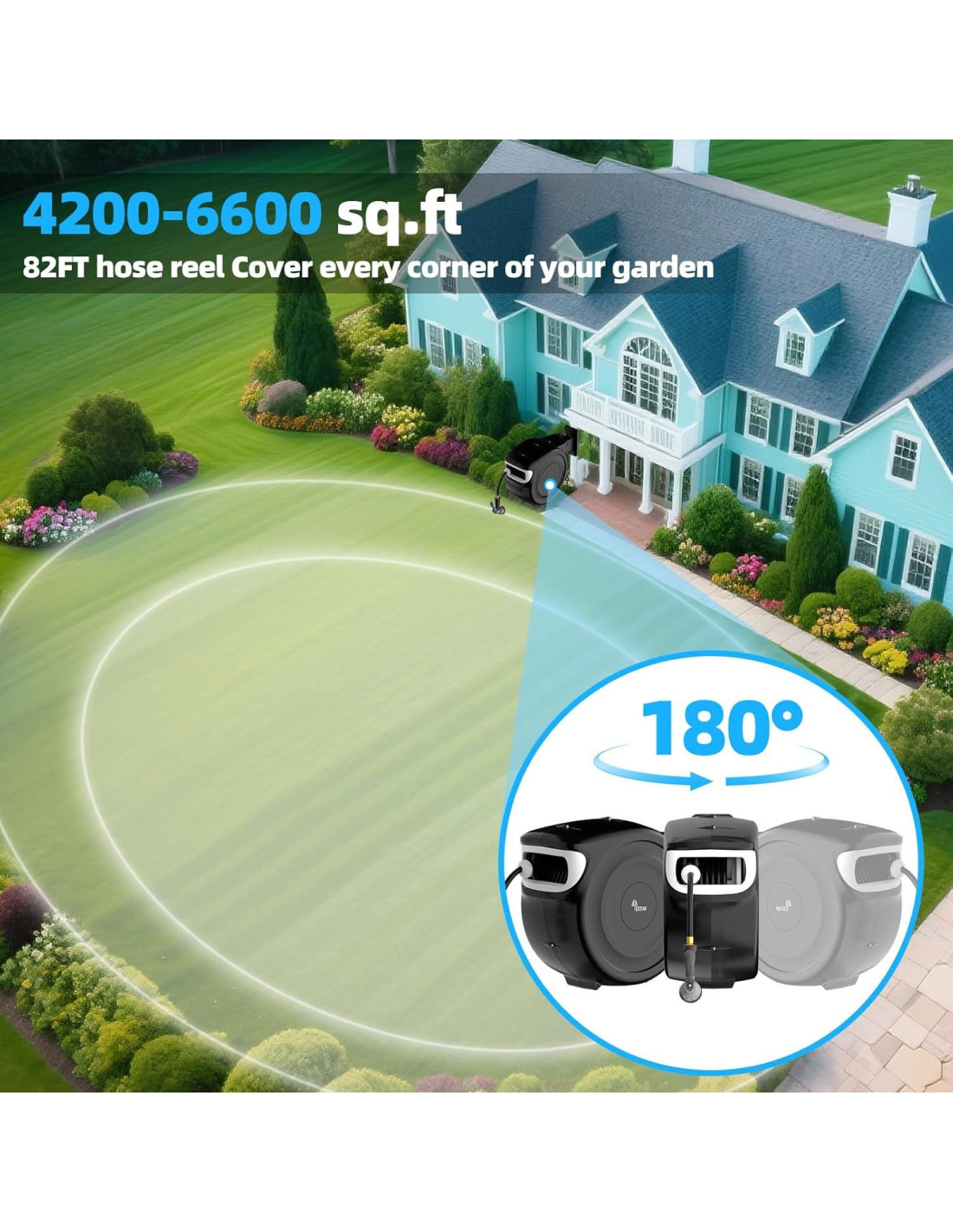 - [Soporte Giratorio de 180 Grados y Cobertura de Área Amplia de 130 pies (40m)] El soporte montado en la pared rotatable de 180 grados integrado asegura un ajuste de ángulo flexible. El carrete de manguera retráctil de 1/2 pulgada de diámetro y 130 pies (40m) cubre 0.8 acres desde un solo punto, satisfaciendo el 99% de las necesidades de los hogares en EE. UU. Riega una villa de 15,000 pies cúbicos en 18 minutos (40% más rápido que las mangueras convencionales). 30% más largo que los modelos de 100 pies, aumentando la cobertura en un 65%.