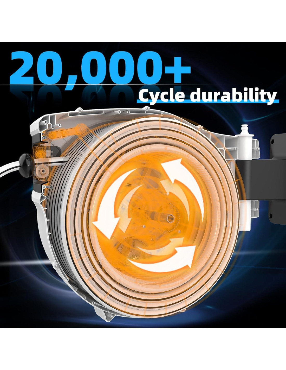 - [Prueba de 20,000 Ciclos y Protección para Todas las Climas] Este carrete de manguera de jardín retráctil ha soportado 20,000 pruebas de retracción. Sobrevivió a pruebas de UV de 300 horas en temperaturas extremas (5C a 55C). Su recubrimiento anti-UV resiste agrietamientos/desvanecimientos, ofreciendo protección total contra fuertes lluvias, sol y congelamiento, duplicando la vida útil. ¡Carretes de manguera perfectos para uso exterior!