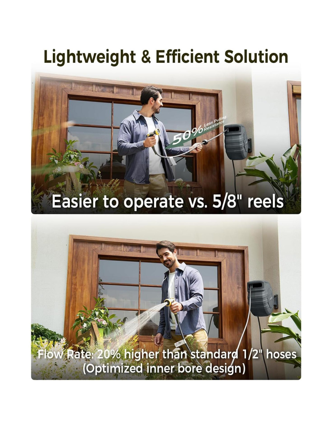 - Protección Doble Resistente a UV y Congelación: Los carretes de manguera para uso exterior cuentan con un recubrimiento resistente a UV, probado para soportar temperaturas de -4F a 122F (-20C a 50C), duplicando la vida útil del producto. Di adiós a las grietas, decoloración y daños por el clima-este carrete está diseñado para uso durante todo el año