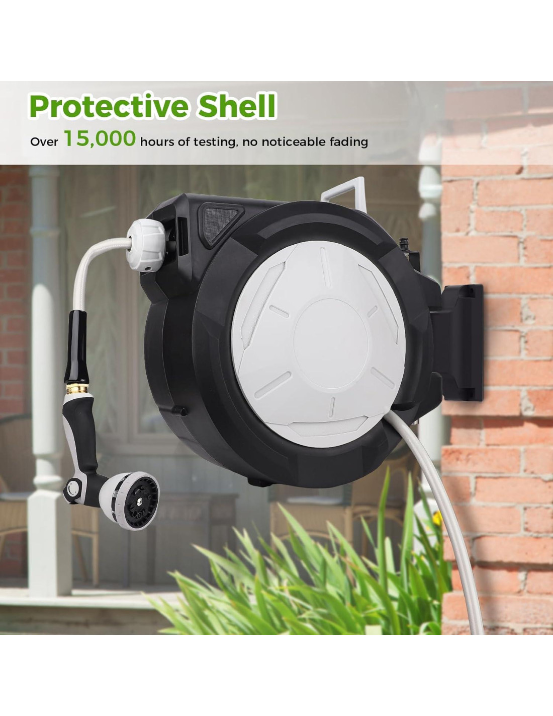 - [Manguera de Jardín de Alta Resistencia] : Manguera de alta resistencia, flexible en cualquier clima y resistente al desgaste, asegurando que el carrete de manguera sea a prueba de fugas y duradero.