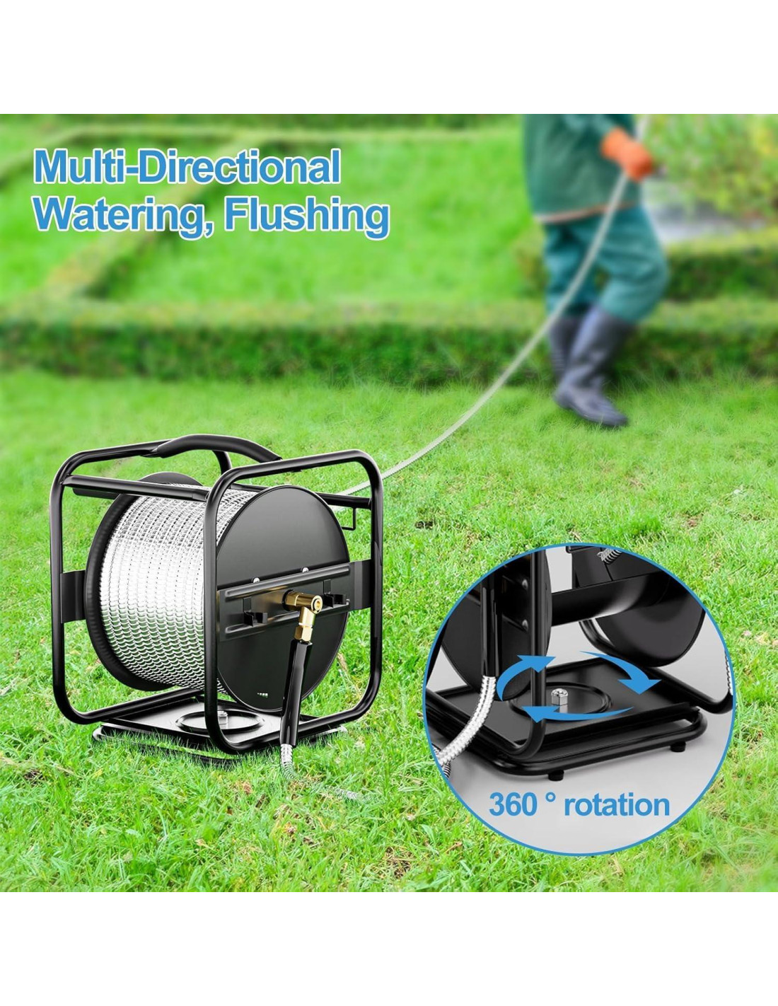 - Estructura de Metal de Grado Militar Nuestro carrete de manguera de metal está hecho de metal de alta resistencia y este carrete durará años, incluso en condiciones cálidas y húmedas. Y nuestra manguera de acero inoxidable está hecha de tres capas de PVC reforzado, por lo que no tienes que preocuparte por fugas y otros problemas al usar.