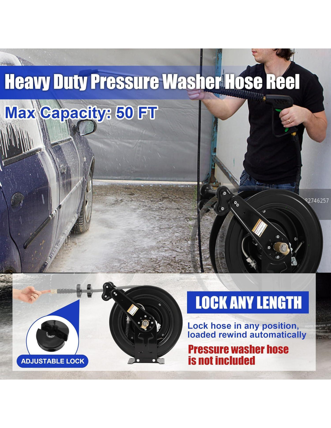 - Rebobinado Automático Controlado: Di adiós a las mangueras enredadas y al tedioso enrollado manual. El carrete de manguera a presión con un mecanismo de resorte retráctil ofrece un retroceso conveniente y controlado para mangueras de lavadora a presión de 3/8" ID de hasta 50 pies de largo. El mecanismo de trinquete de bloqueo en múltiples posiciones permite asegurar la longitud deseada de la manguera, proporcionando flexibilidad y facilidad de uso.