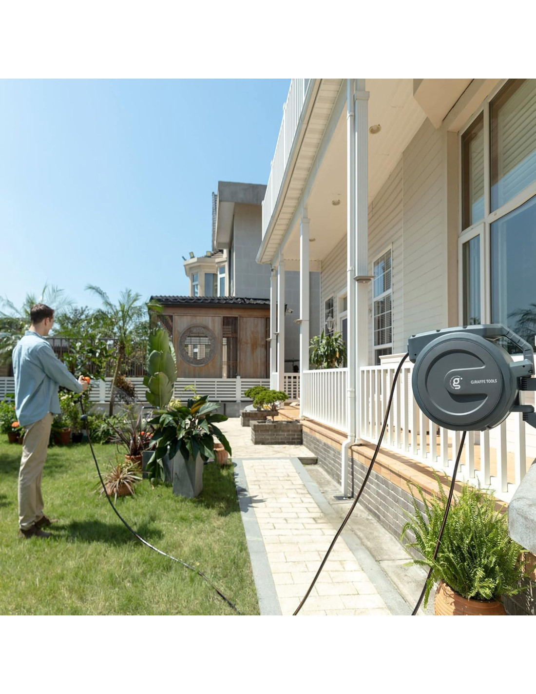 - Bloqueo de Cualquier Longitud: El carrete de manguera Giraffe está preinstalado con 125 manguera híbrida y 5 pies de manguera de entrada, que se puede bloquear a cualquier longitud que desees, cubriendo cada rincón de tu jardín.