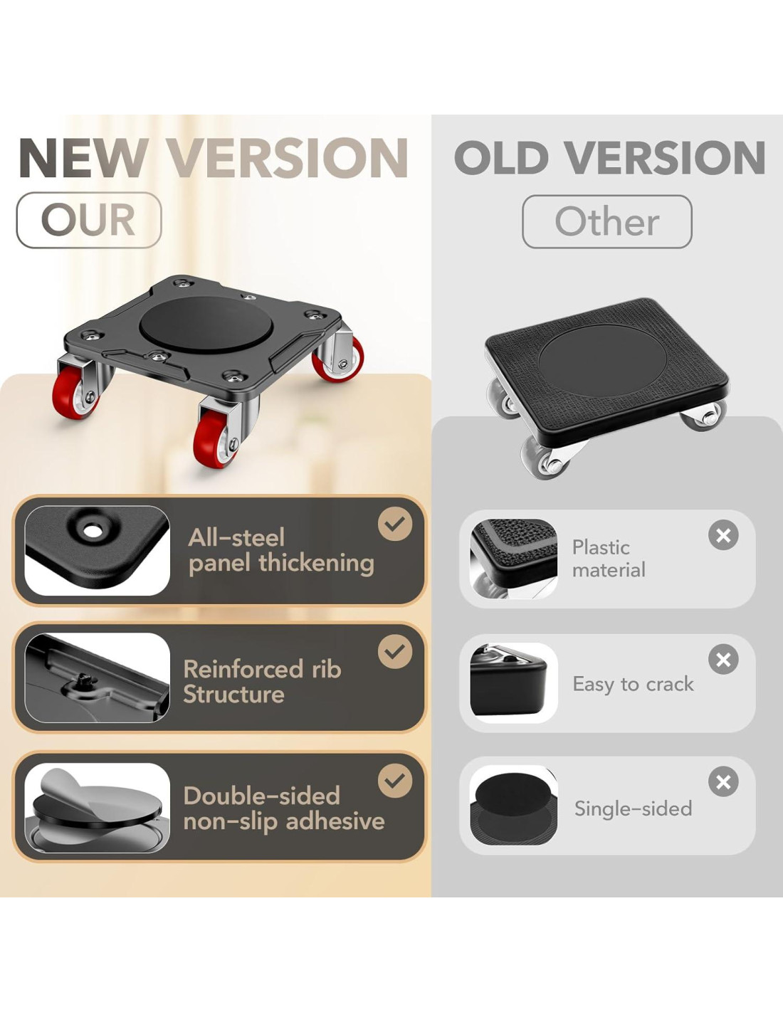 - DISEÑO ANTI-DESLIZANTE SUPERIOR: Cada carretilla de muebles está equipada con almohadillas anti-deslizantes de doble cara, asegurando que tus muebles se mantengan estables durante el transporte y no se deslicen. Por favor, usa al menos dos personas al mover muebles grandes