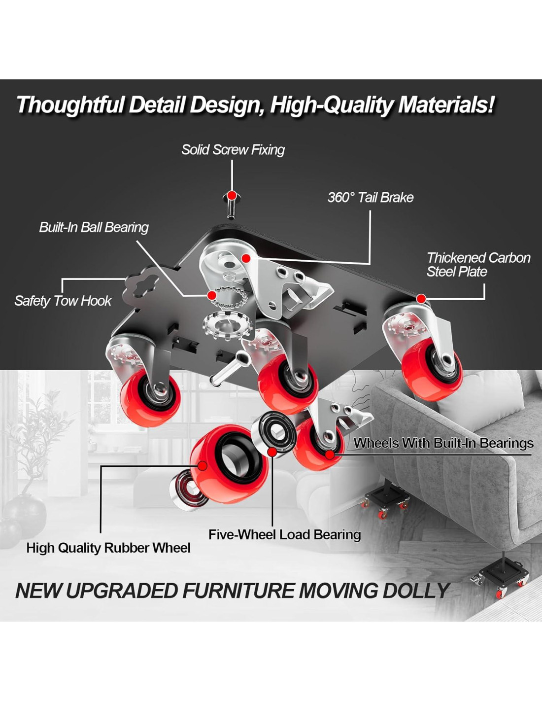 - [Movimiento Suave y Flexible con Estabilidad de Freno Trasero]: Esta carretilla de mudanza cuenta con cinco ruedas de doble rodamiento de bolas rotativas 360, ofreciendo mayor flexibilidad y rodaje suave incluso bajo cargas pesadas. El sistema de freno trasero permite bloquear tanto el movimiento hacia adelante/reversa como la rotación de 360, asegurando estabilidad una vez que su mueble está en posición.