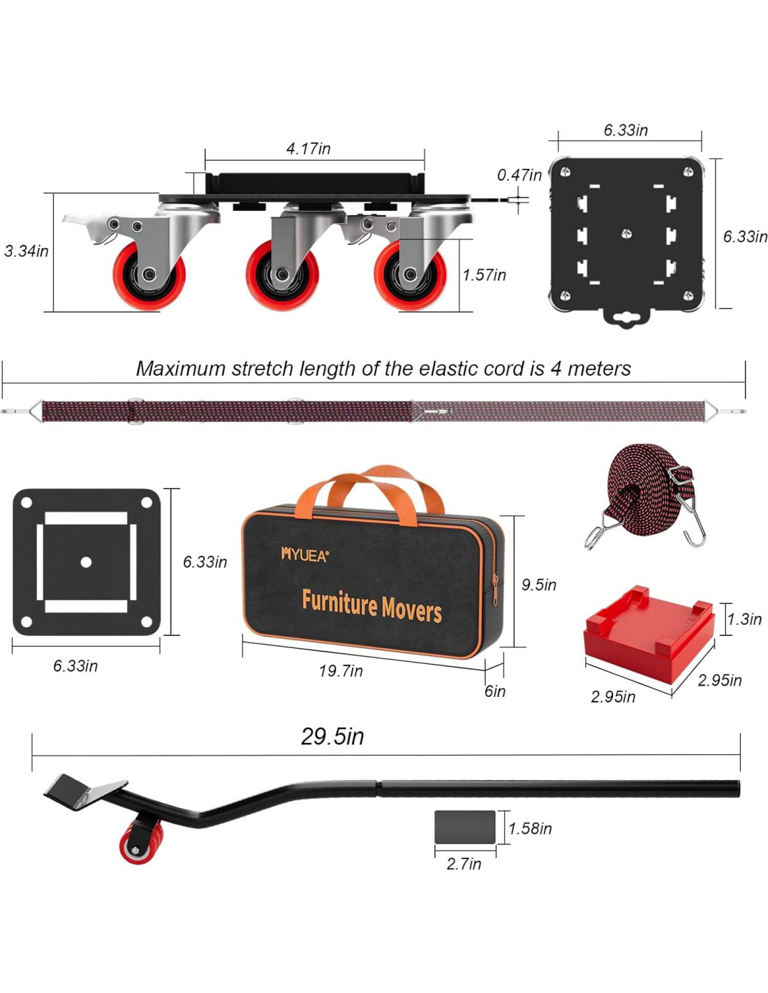 - [Kit Completo de Herramientas para Elevar Muebles]: Esta carretilla incluye cuatro carretillas de muebles de 6.33" x 6.33" (16,1 cm x 16,1 cm), 4 almohadillas antideslizantes para carretillas, 16 protectores removibles, 1 cordón elástico, 1 palanca, 2 almohadillas antideslizantes para palanca, 4 bloques elevadores, 1 par de guantes y 1 bolsa de almacenamiento de lona. Todo lo que necesita para una experiencia de mudanza segura, eficiente y fácil con esta carretilla de muebles premium.