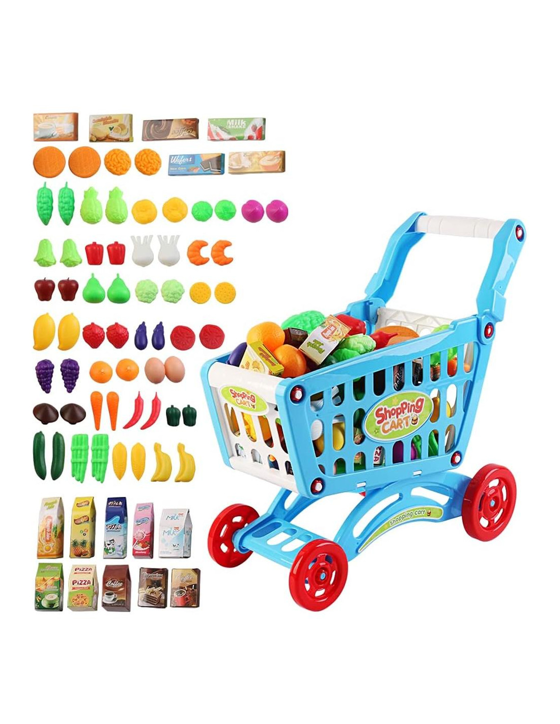 - CONTENIDO: Este set incluye una variedad de más de 70 accesorios de compras que a tu hijo le encantarán. Los accesorios incluyen; frutas, verduras y los esenciales que compras. El carrito de compras requiere un fácil ensamblaje sin herramientas necesarias, creando menos estrés para ti y más diversión para tu pequeño.