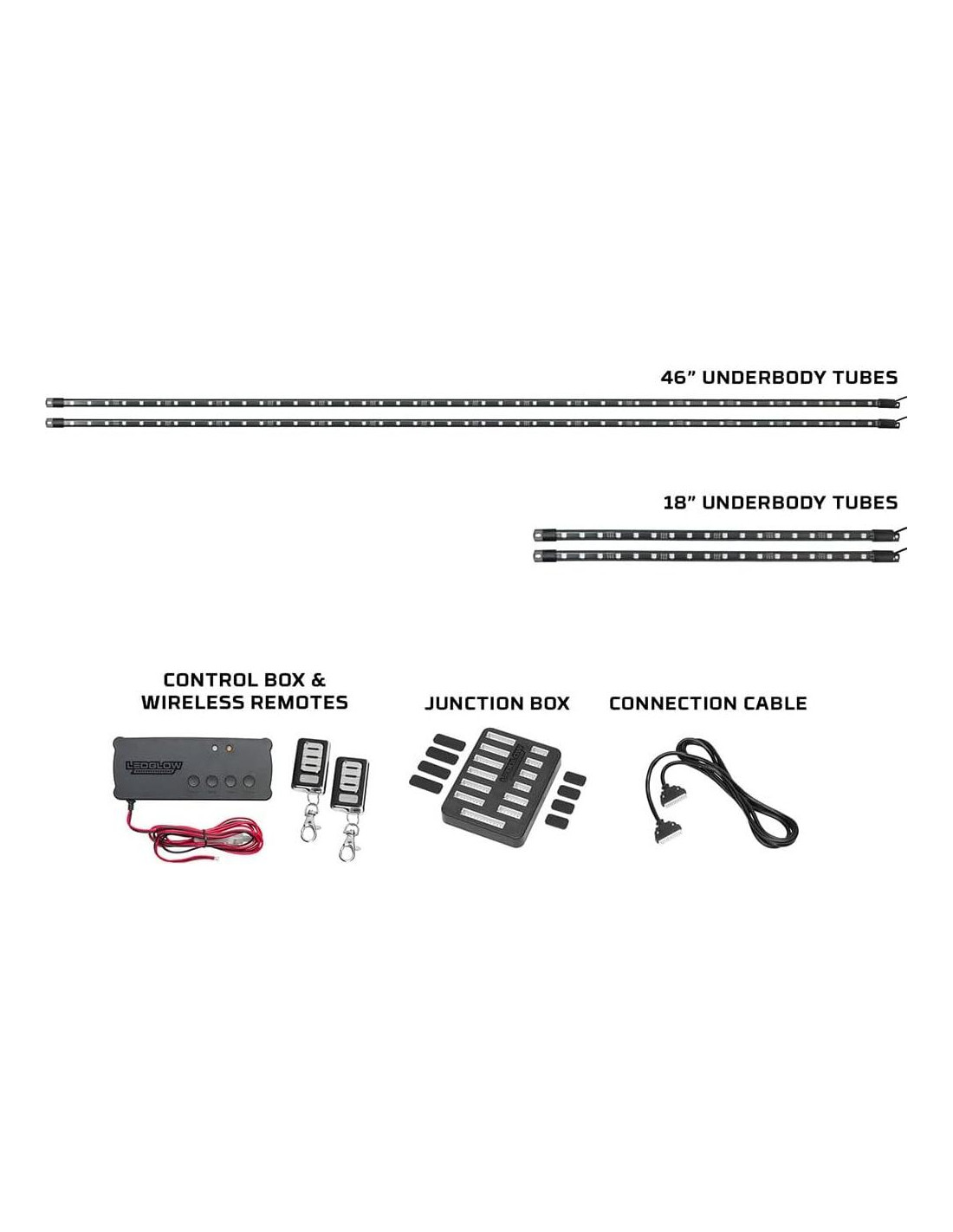 - Incluye (2) Tubos de Bajo Cuerpo Flexibles y Resistentes al Agua de 46 pulgadas (116.84 cm) y (2) de 18 pulgadas (45.72 cm) que Albergan 132 LEDs SMD, Caja de Control con Reductor de Voltaje Incorporado, 2 Controles Remotos Inalámbricos, Caja de Conexiones de 12 Puertos con 8 Enchufes, Cable de Conexión, Tornillos Autoperforantes y Bridas