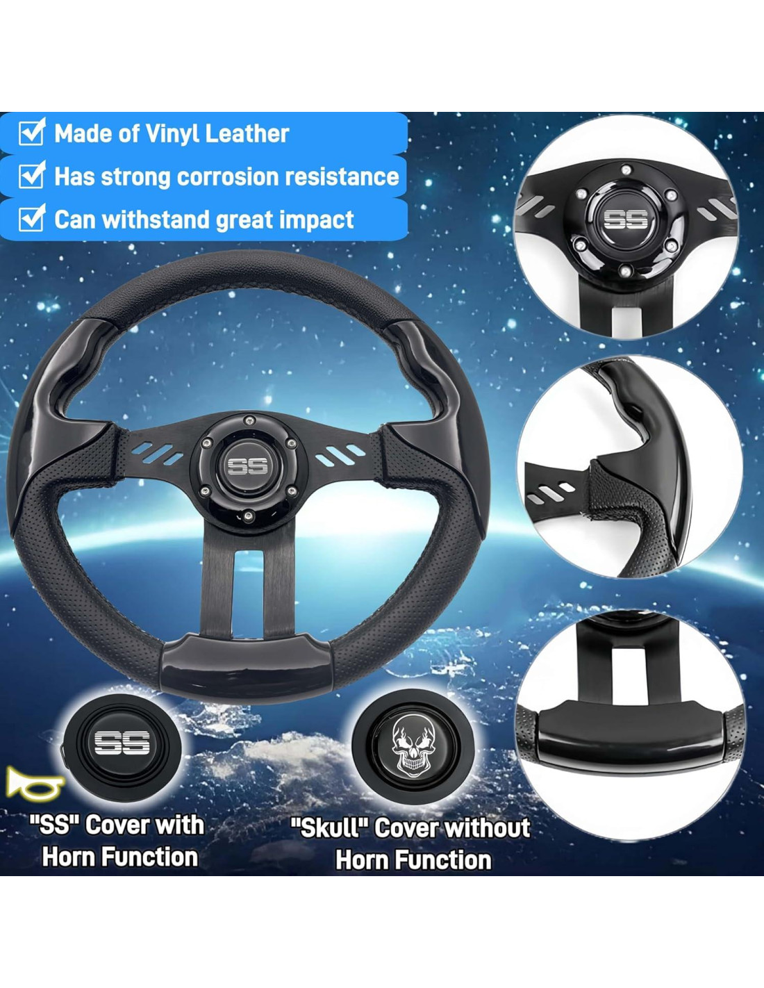 - Ajuste Universal y Construcción Premium: Presenta un volante de carrito de golf de 12.5 pulgadas (31.75 cm) de estilo lujoso diseñado para ajustarse a Yamaha, EZGO, Club Car y la mayoría de los modelos del mercado. Fabricado con una cubierta de PVC premium y un núcleo de aluminio de grado aeroespacial, resiste daños por UV, corrosión y se mantiene fresco en altas temperaturas. Nota: Adaptador se vende por separado (compatible con el adaptador WUKO-HUNT).