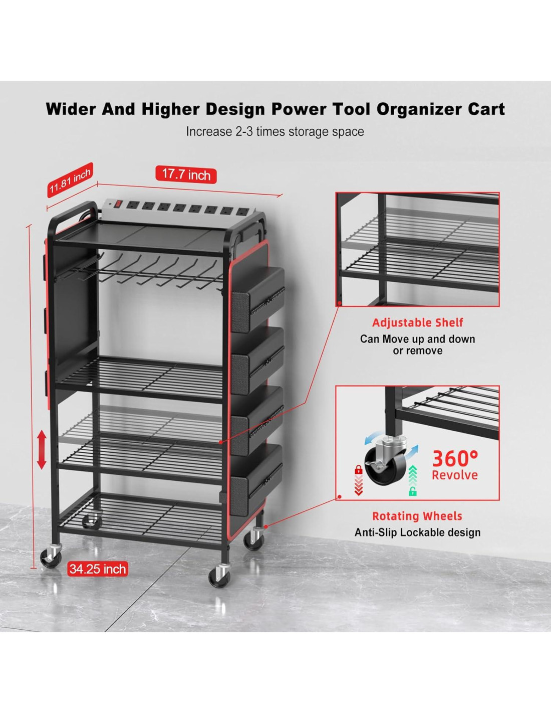 - Diseño de Bolsillos Organizadores Laterales y Bolsa de Herramientas: Nuestro carro organizador de herramientas de gran potencia sobre ruedas con toma de corriente de 8 salidas incluye 4 estantes y 1 capa para sostener taladros, que puede almacenar hasta 8 taladros o ser utilizado como ganchos. Un lado tiene un diseño de bolsillos organizadores, que involucra 23 ranuras de diferentes tamaños y 2 capas de almacenamiento. El otro lado es un diseño de bolsa de herramientas de alta resistencia, que es desmontable y plegable para llevar herramientas fácilmente a cualquier lugar. Ambos lados pueden sostener herramientas manuales como pinzas, destornilladores, llaves, tijeras, martillos, etc. Equipado de manera innovadora con 4 ruedas para facilitar el movimiento.