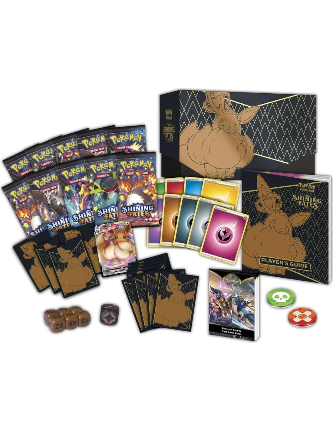 - La Caja de Entrenador Élite de Pokémon TCG: Destinos Brillantes incluye: 10 paquetes de refuerzo de Pokémon TCG: Destinos Brillantes. 1 carta promocional foil con Eevee VMAX. 65 fundas para cartas con Gigantamax Eevee. 45 cartas de Energía de Pokémon TCG.