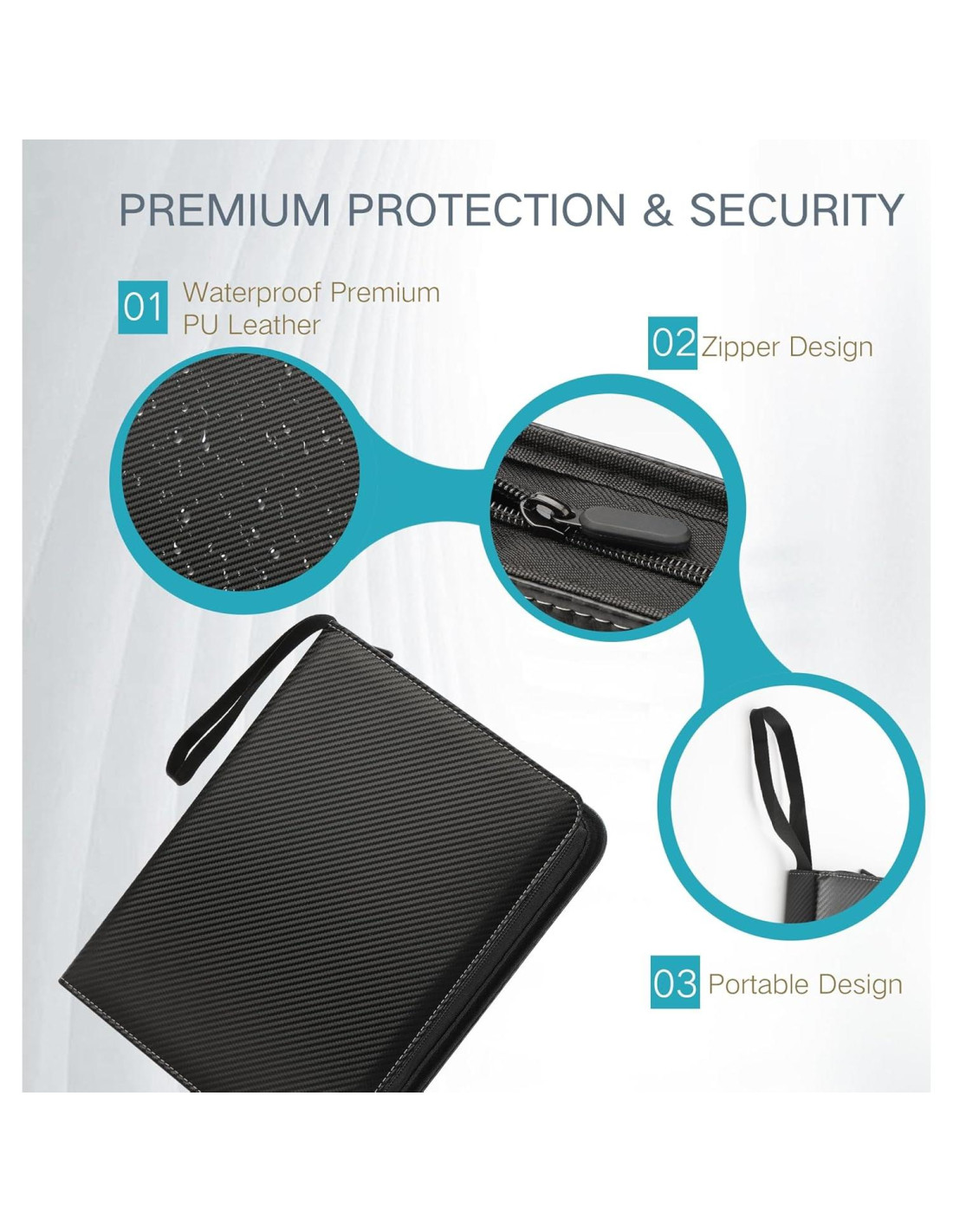 - [Alta Calidad y Seguridad] La carpeta de cartas cuenta con cuero PU premium resistente al agua y un diseño de cremallera resistente, para mantener tus cartas de juego seguras. El agua o las gotas de lluvia no se filtrarán. El material principal de las fundas de cartas transparentes es PP claro, además, la página de bolsillo transparente es excelente para exhibir cartas, puedes localizar las cartas en un minuto y ver todos los detalles de las cartas valiosas, sin necesidad de sacarlas para evitar daños. Protege bien tus cartas de desvanecerse y mancharse.