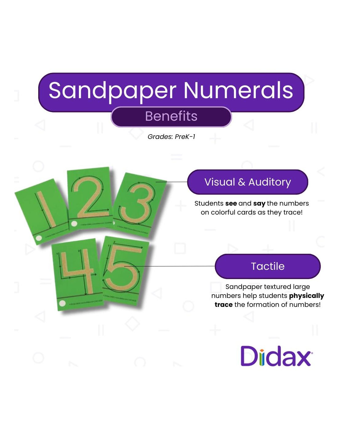 - Ayuda a tu hijo a comprender los fundamentos de las matemáticas con confianza y facilidad - Fomenta el amor por el aprendizaje y la numeración desde una edad temprana. Los números de papel de lija Didax hacen que el aprendizaje sea interactivo y agradable, lo que fomenta la curiosidad y el deseo de explorar en el futuro. Este producto se alinea con el estilo de aprendizaje Montessori, ideal para guarderías, centros de aprendizaje temprano, escuelas en casa y PK-2.