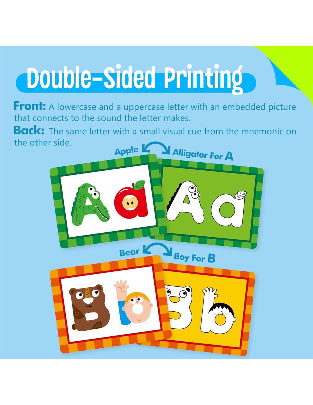 - Impresión a Doble Cara: Diseño a doble cara: Cada tarjeta presenta una letra minúscula y una letra mayúscula en el frente, acompañada de imágenes que representan su sonido. La parte posterior muestra las mismas letras con una pequeña pista visual relacionada con la imagen del frente, lo que puede reforzar la conexión entre la letra, el sonido y la imagen.