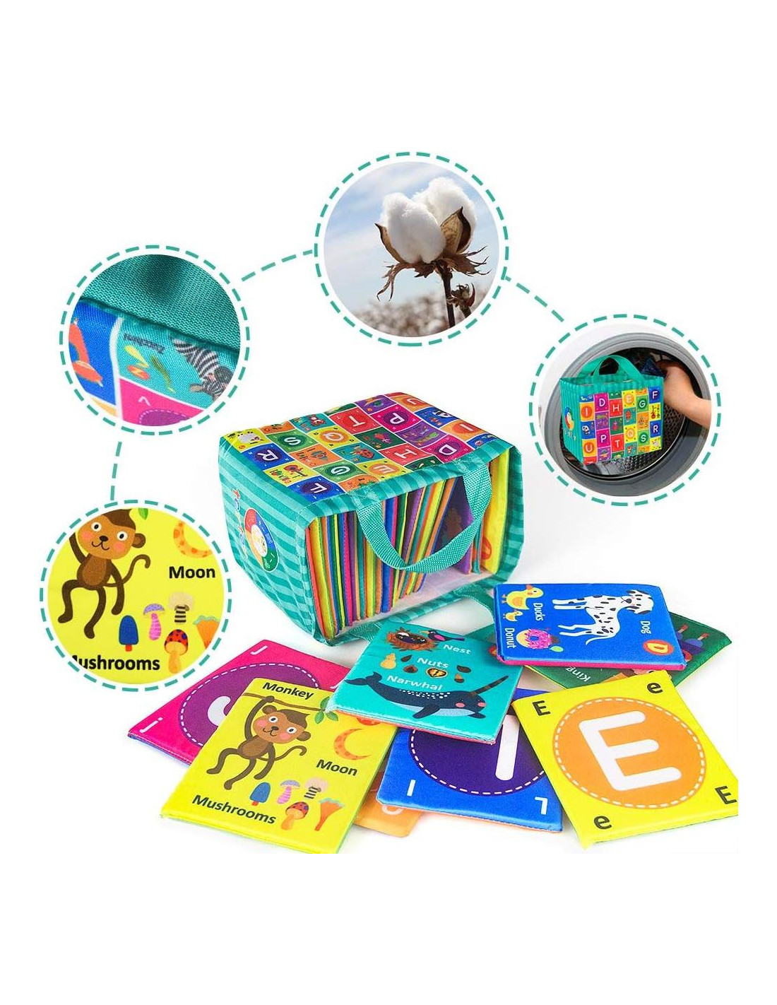 - ELIMINA LA NECESIDAD DE PREOCUPARTE POR TU BEBÉ MIENTRAS "LEES" CON ÉL: Nuestras Tarjetas de Letras Suaves son totalmente seguras para tu bebé: no tóxicas, con costuras fuertes, lavables. Tela como tarjetas de flash, colores llamativos, ejemplos de cosas que comienzan con una letra en la parte posterior, son muy visuales y captan la atención de tu bebé, y lo suficientemente pequeñas para jugar con ellas y sabes que durarán mucho porque están hechas de tela en lugar de cartón. También viene en una bolsa que puedes llevar o almacenar.